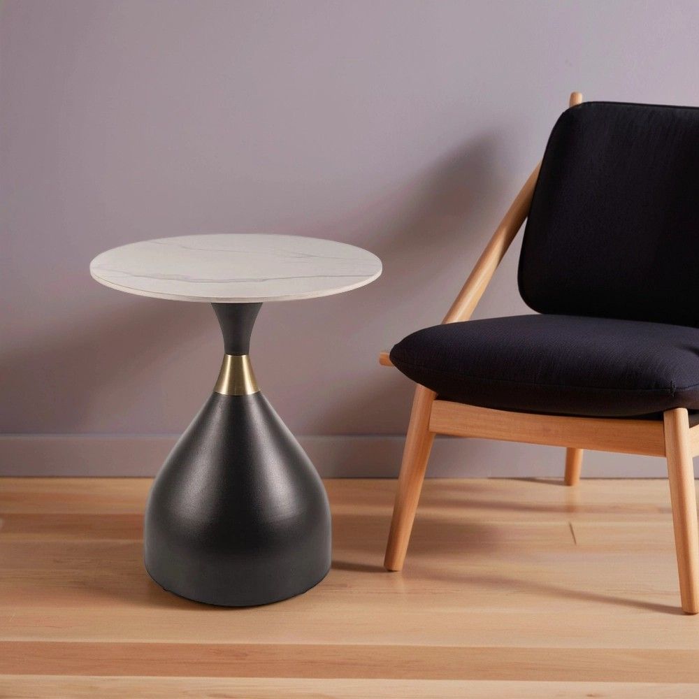 Материалы: Столешница — керамика (белая, с мраморным эффектом), каркас — металл (матовый черный и матовый золотой) .