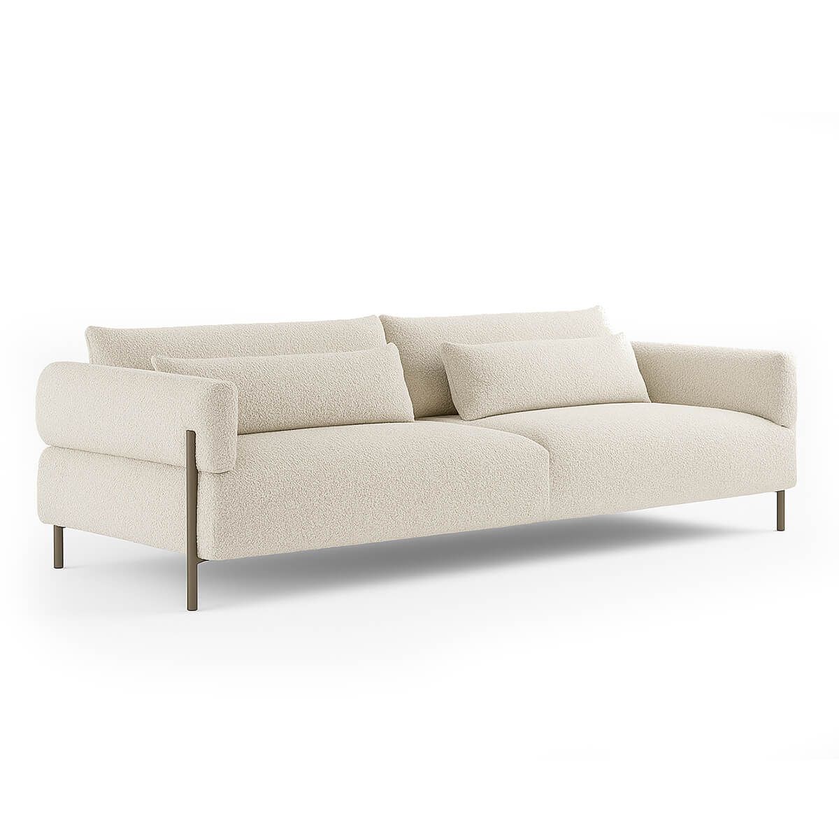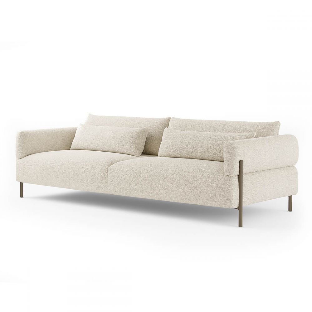 Главное в Кайлморе — это его силуэт и опоры. Четыре изящные металлические ножки делают диван визуально невесомым. Он словно парит над полом. Передние ножки при этом заходят на подлокотники — смелый конструктивный ход, который превращает обычный диван в архитектурный объект.