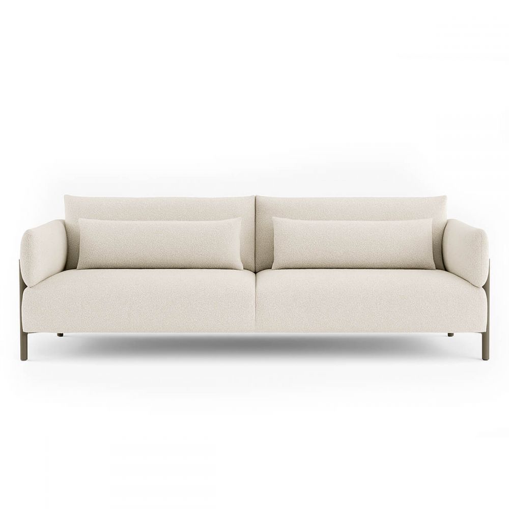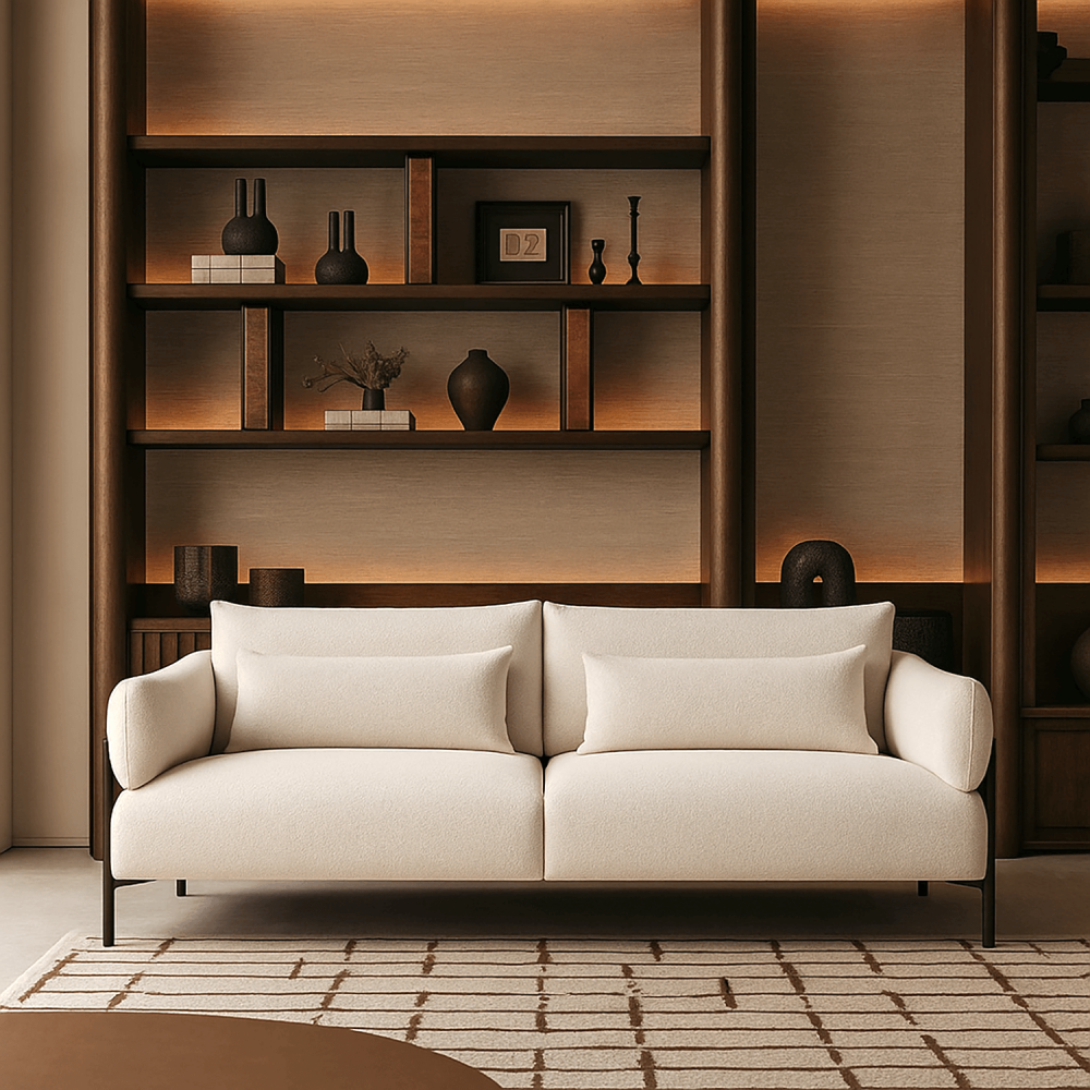 Чрезвычайно лаконичный двухместный силуэт. Диван парит на четырёх изящных металлических ножках. А передние опоры деликатно заходят на подлокотники, создавая архитектурный диалог между невесомостью и структурой. Это не просто диван. Это скульптура для гостиной.