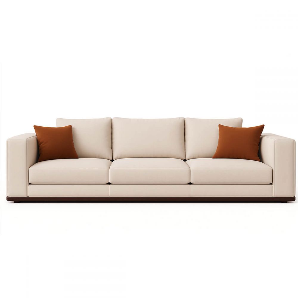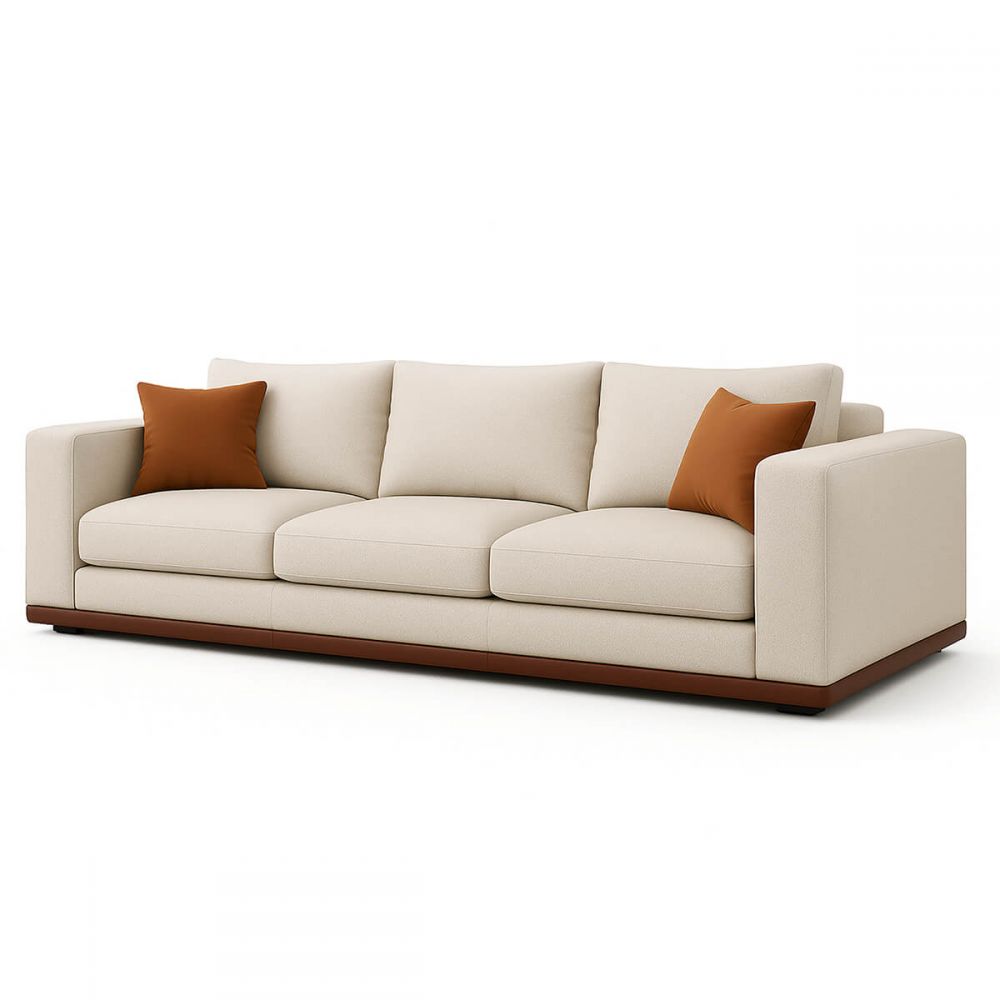Прямоугольный прямой силуэт с чёткими линиями. Мягкие тканевые подушки контрастируют с кожаным основанием. Это диван, который вмещает всех, но не выглядит громоздким. Гармония противоположностей, рассчитанная на большую семью.