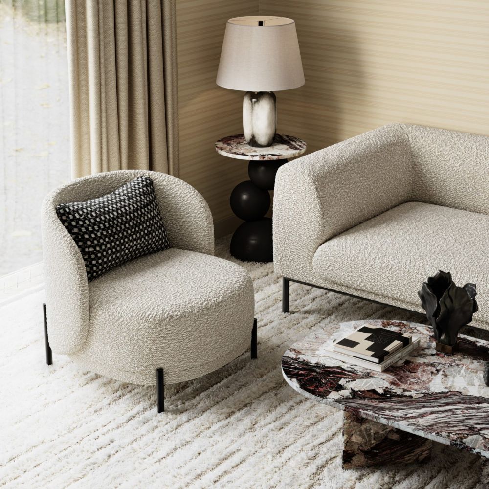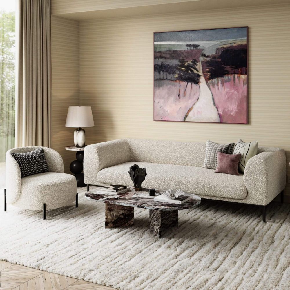 Освобождает пространство. Благодаря компактным размерам (2350х1040) и визуальной лёгкости металлических ножек комната кажется больше, чем есть. Становится центром. Диван не теряется. Его чёткий силуэт и контрастные опоры притягивают взгляд. Это достойный акцент даже в самой скромной по площади гостиной. Вписывается в любой современный интерьер. Минимализм: Идеально. Ничего лишнего. Сканди: Металлические ножки и светлая обивка — классика жанра. Лофт: Металл + грубые текстуры (рогожка, букле) = органичное сочетание. Современная классика: Мягкие формы дивана и строгость металла дают интересный контраст.