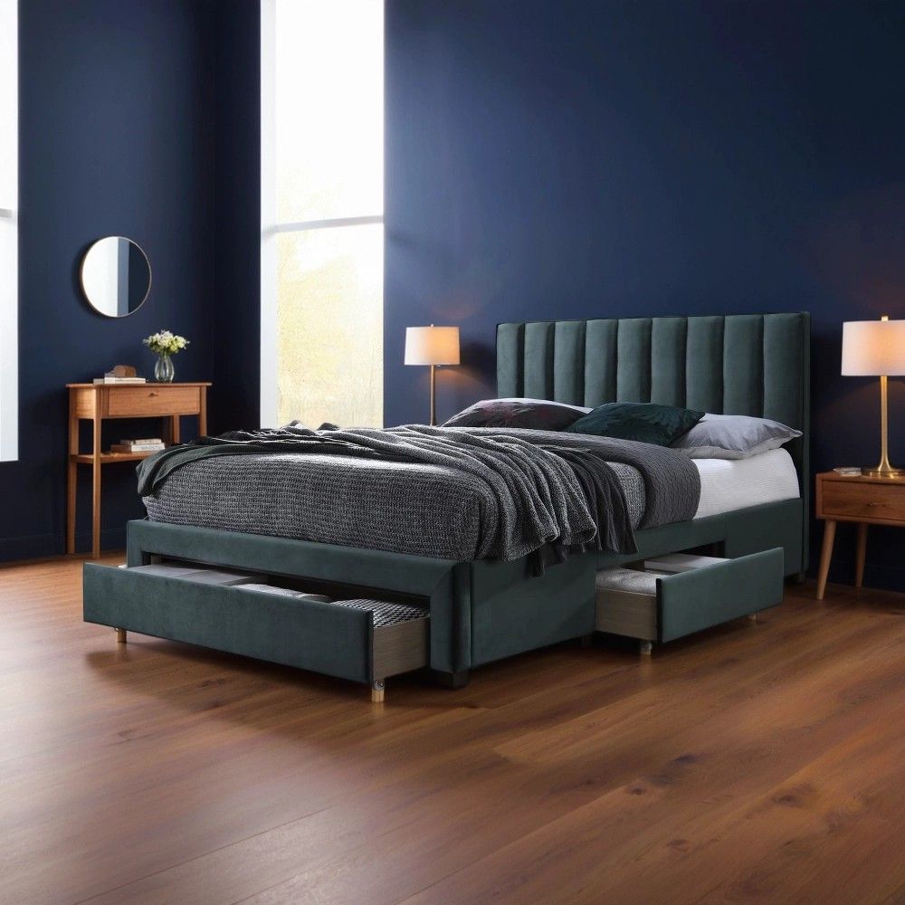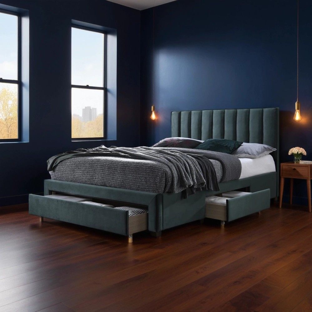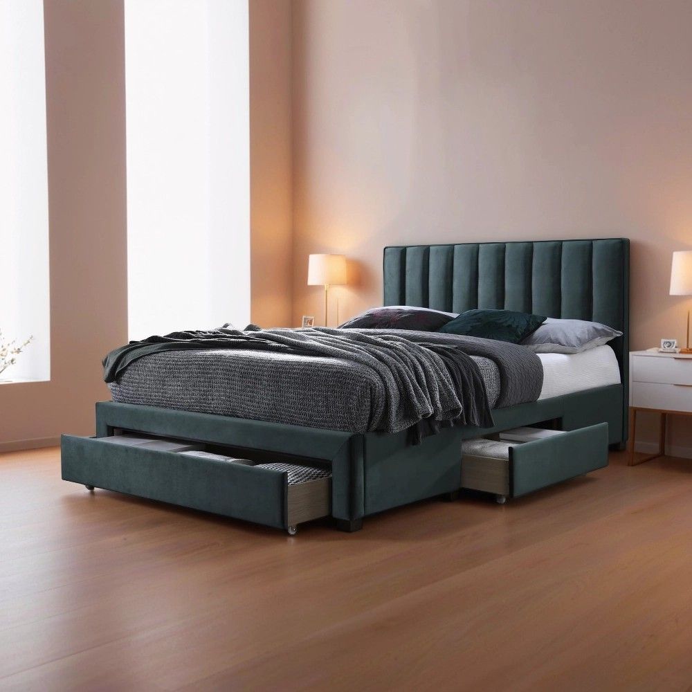 Функциональная кровать с ящиками для хранения. Обивка выполнена из ткани, каркас изготовлен из массива дерева (гевея). Модель сочетает современный дизайн с практичностью. Гарантия 12 месяцев. Матрас в комплект не входит.