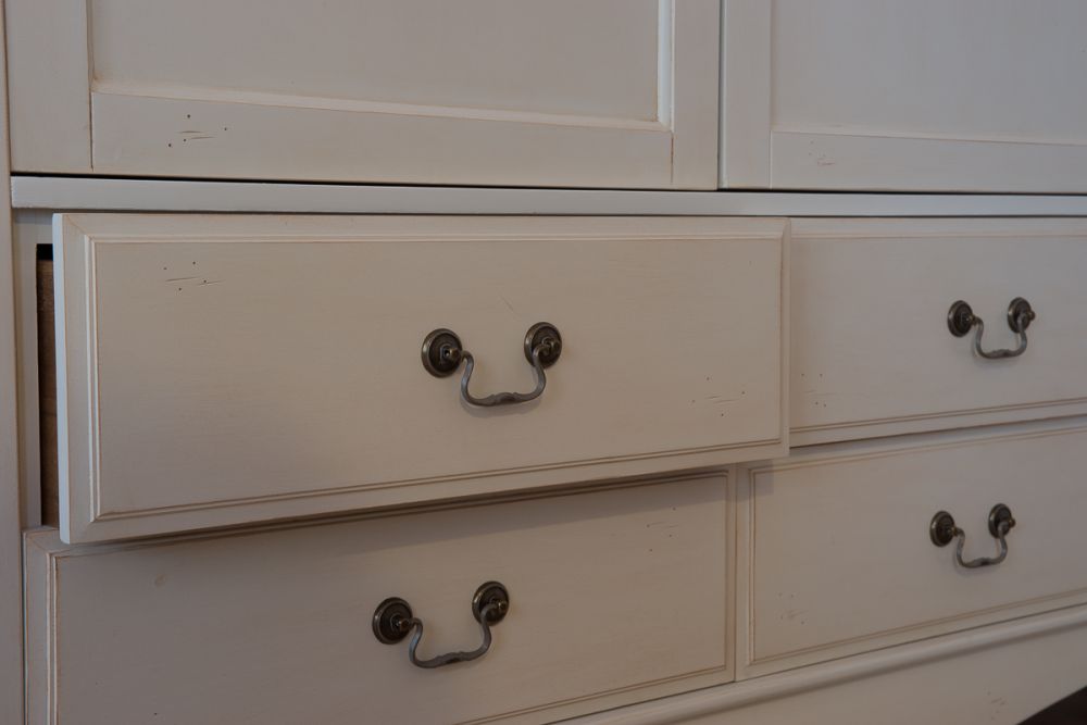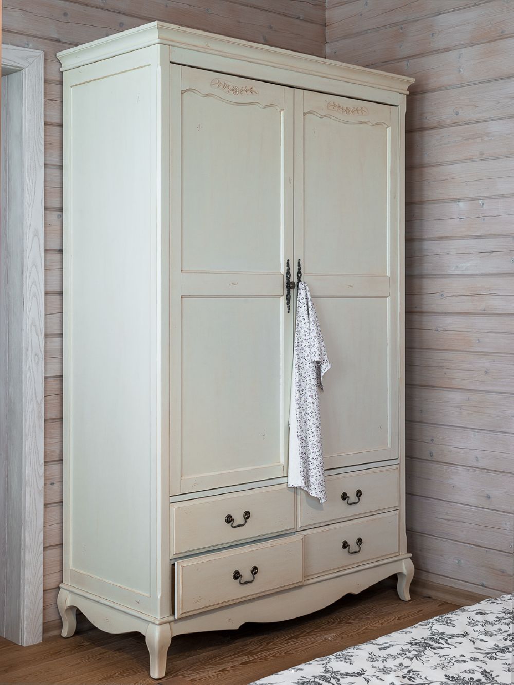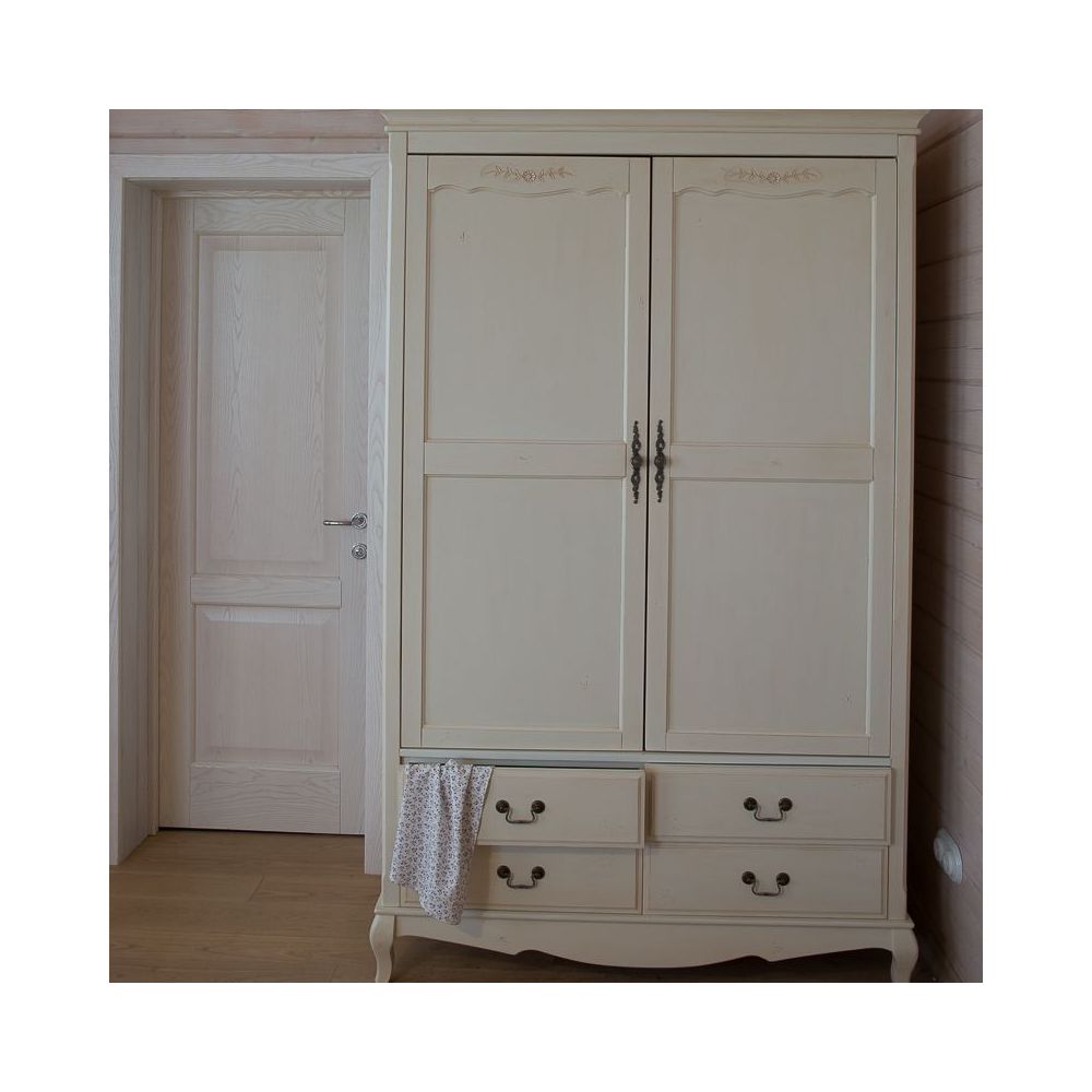 Двухдверный шкаф Belveder в стиле Прованс – это не просто мебель, а предмет с характером. Его цвет – нежный молочный с эффектом старения, достигаемый мастерски выполненным искусственным состариванием. Червоточины и царапины, созданные руками мастеров, придают шкафу уникальный шарм и неповторимый винтажный вид, словно он хранит память о французской провинции.