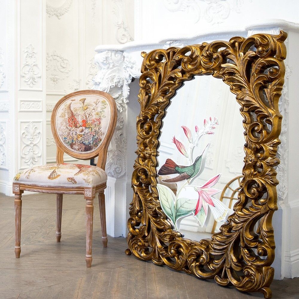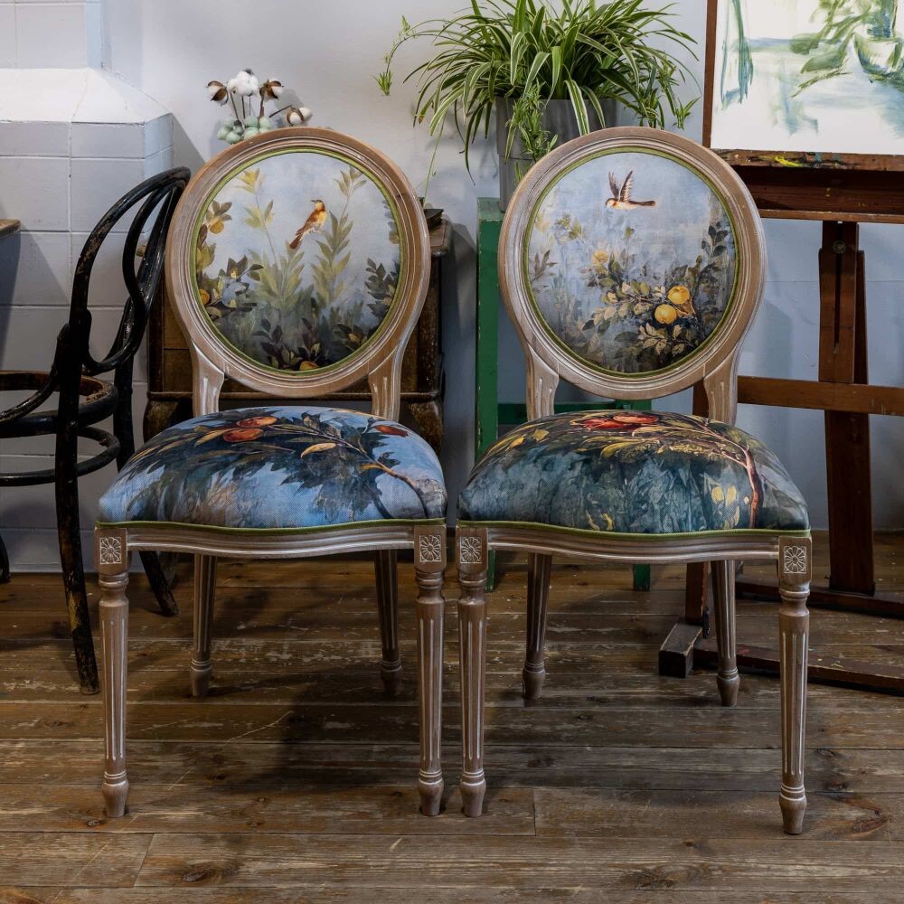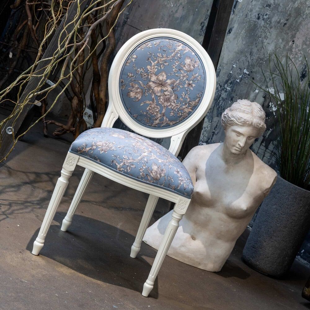 Небесно-голубой стул с акварельными цветочными узорами воплощает французскую романтику. Резной буковый каркас и нежная обивка создают ощущение легкости. Модель особенно хороша для создания зоны уединения в спальне или кабинете.