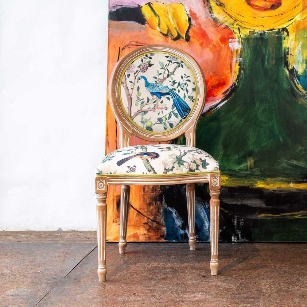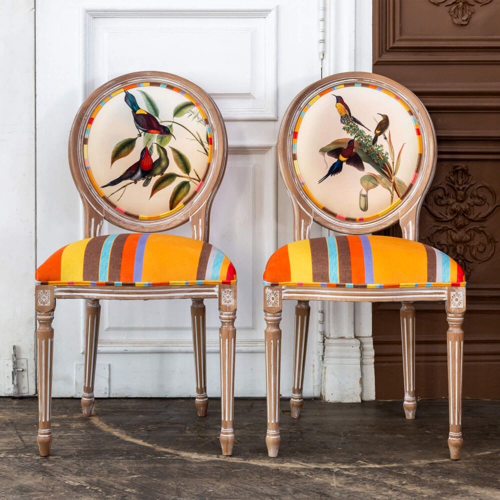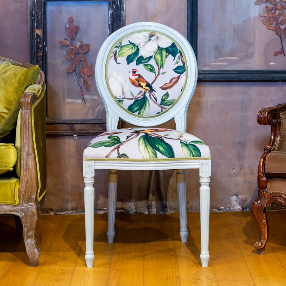 Иллюстрации английского орнитолога Джона Гульда XIX века оживают на спинке этого стула. Научная точность в изображении птиц сочетается с художественной выразительностью. Модель добавляет интерьеру природной динамики и тепла.
