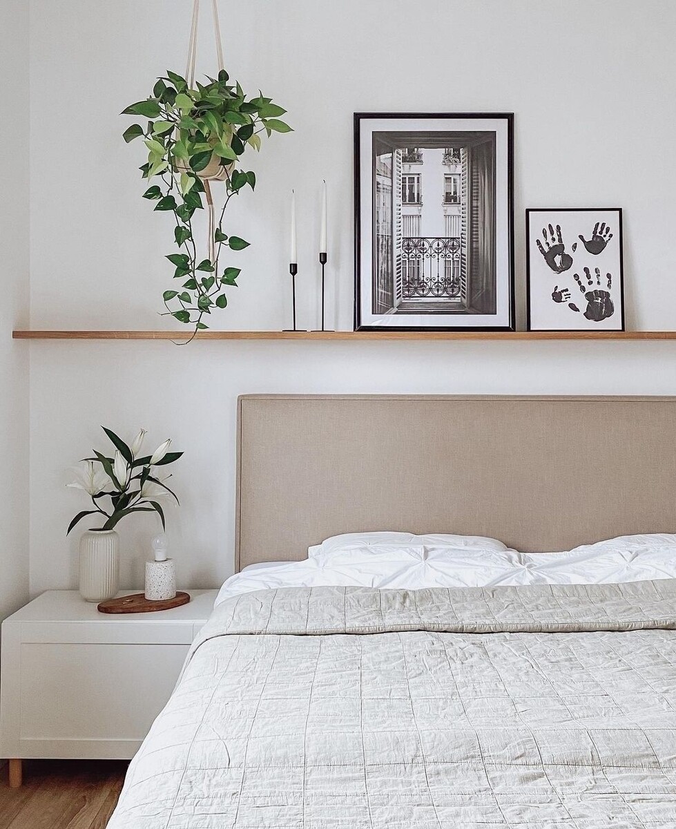 Настенные полки над кроватью сочетают декоративную и практическую функции. Они помогают организовать систему хранения в спальне.