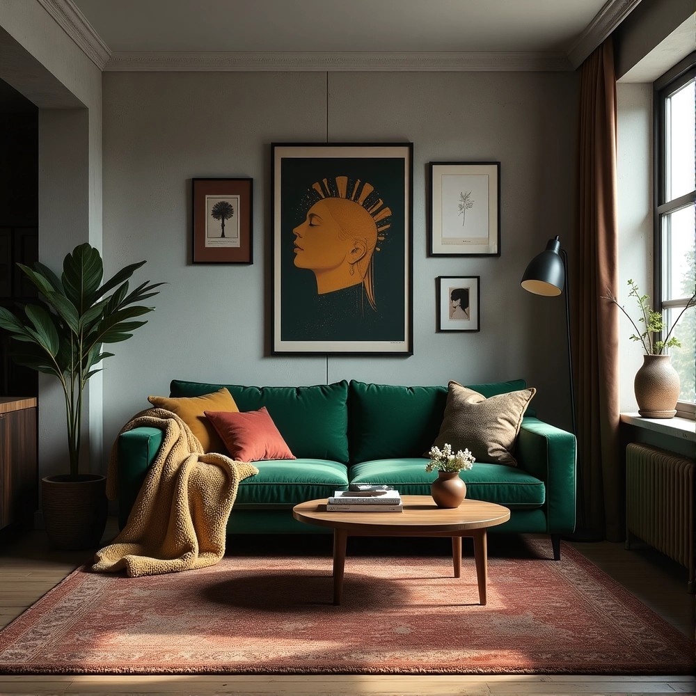- Смелые комбинации глубоких оттенков (терракотовый, изумрудный) и контрастных текстур