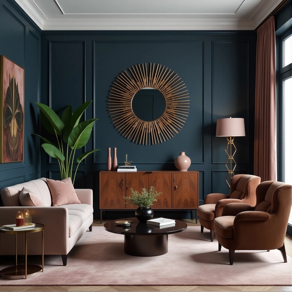 - Глубокие, насыщенные цвета стен: темно-синий, графитовый, черный