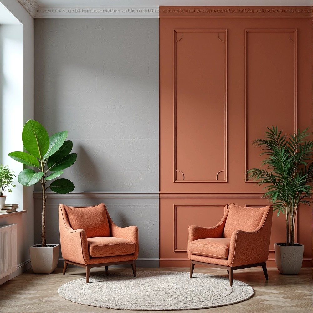 Создает ощущение офисного, неуютного пространства. Актуальными становятся землистые, сложные оттенки: охра, цвет глины, теплый тауп, глубокие зелено-серые тона (greige).