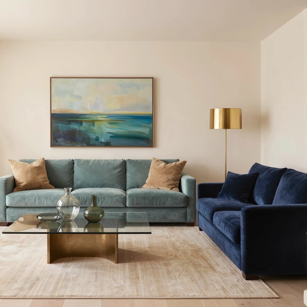 Если ваша душа просит лёгкости с намёком на тайну, создайте фон из тёплого бежевого или цвета слоновой кости. Акцентным героем сделайте мебель или текстиль в цвете Hidden Gem — том самом дымчато-нефритовом, или в глубоком синем. Эта комбинация напоминает морскую пену у тёплого песчаного берега. Объединить их помогут блестящие поверхности: дымчатое стекло ваз в технике «фьюме», металл оттенка «шампань» или уютный вельвет.