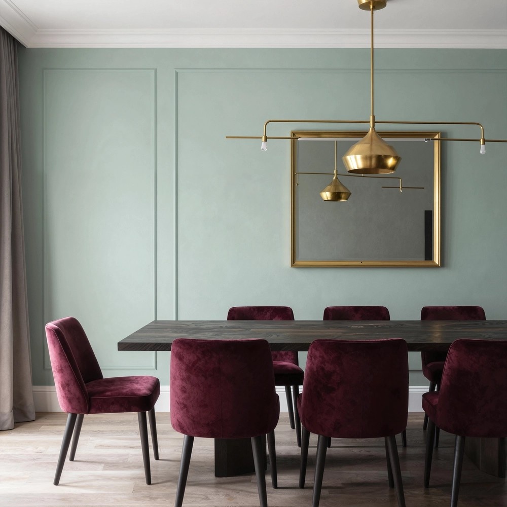 Самый смелый и поэтичный сценарий. В качестве нежной, обволакивающей базы используйте пудрово-розовый или нежный селадоновый. На их фоне акцент цвета Sanguine или тёмного шоколада прозвучит не крикливо, а как уверенное, роскошное заявление. Поддержат этот диалог глянцевые поверхности, бархатные ткани и состаренные зеркала в латунных рамах.