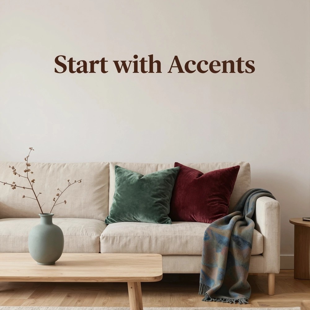 Добавьте три новых предмета: керамическую вазу терракотового оттенка на обеденный стол, латунный подсвечник на каминную полку и набор зелёных бархатных подушек на диван. Правило трёх работает безотказно!