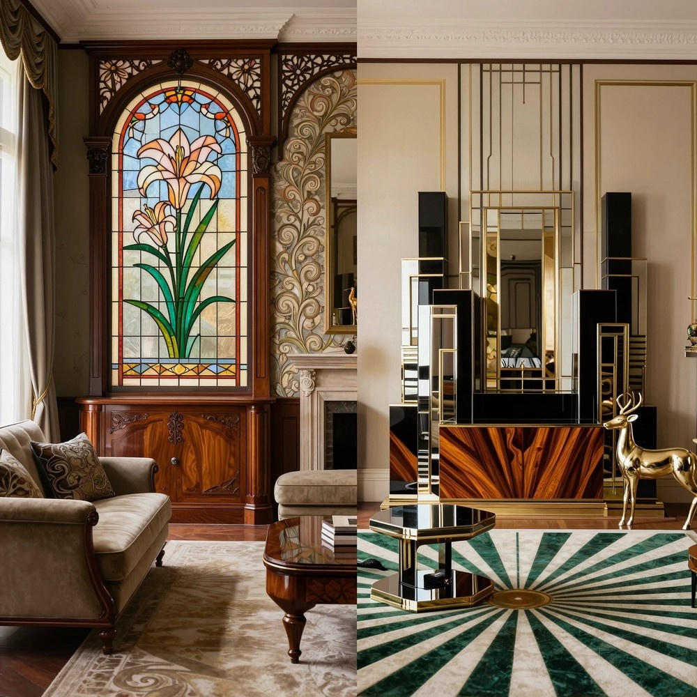 Ар-нуво — это цветок, ар-деко — кристалл. Первое похоже на изгибающийся стебель, второе — на ограненный бриллиант. Эта метафора помогает не путать даже в мелочах.