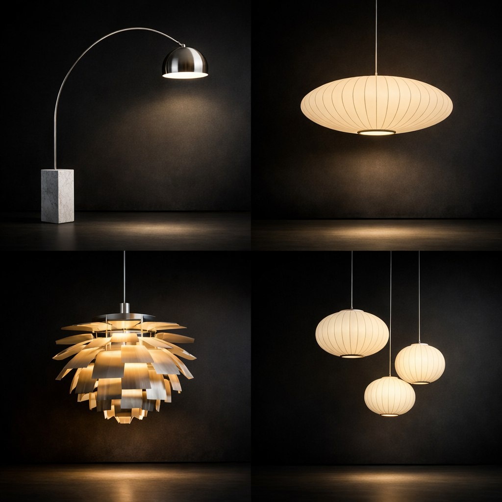 - Торшеры — главный хит. Арка, уходящая в потолок (Arco Castiglioni), или стройная тренога с абажуром-тарелкой. Абажур направлен вниз, создавая островок тёплого света.