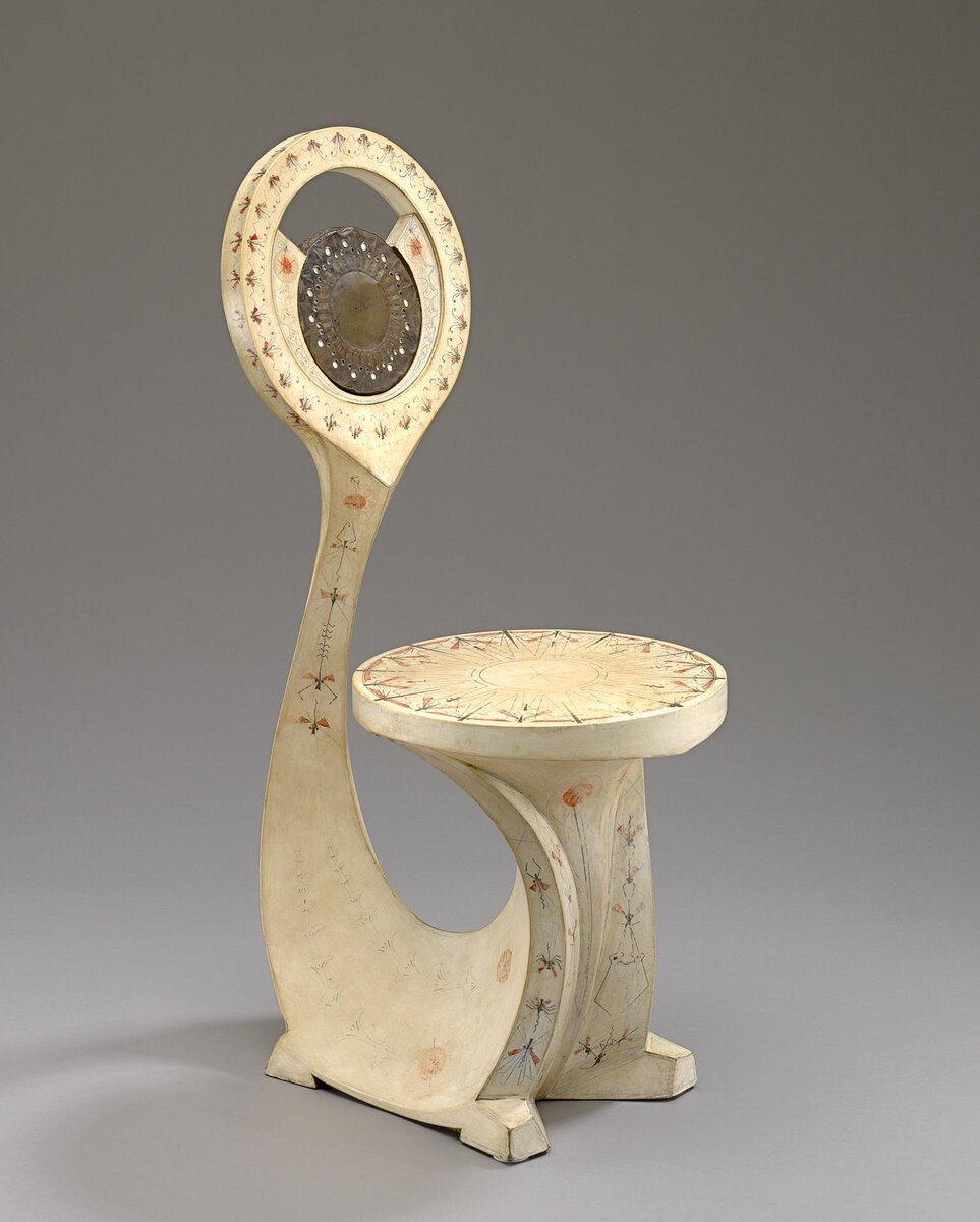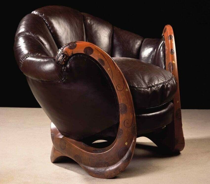 Вот, например, его кресло 1902 года. Дерево, пергамент, медь, инкрустация слоновой костью. Оно похоже на инопланетный артефакт — плавные линии, восточные мотивы, невероятная детализация. Карло работал на стыке модерна и ориентализма, и его мебель невозможно спутать ни с чьей другой.