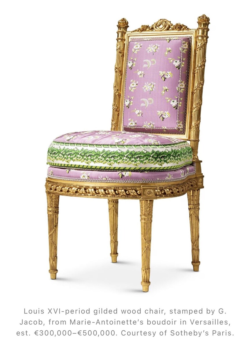 Это не просто кресло — это машина времени. Резное дерево, сусальное золото, шелковая обивка с королевскими лилиями. Его создали в 1780-х годах для будуара французской королевы. После революции кресло чудом уцелело — его выкупили коллекционеры, а позже оно кочевало по частным собраниям.