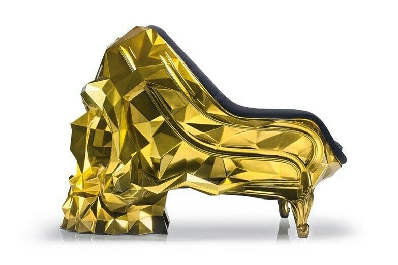 Французский дом Harow создал кресло для настоящих смельчаков. Оно называется Skull Chair и представляет собой гигантский череп из 24-каратного золота, с черным бархатным сиденьем внутри.