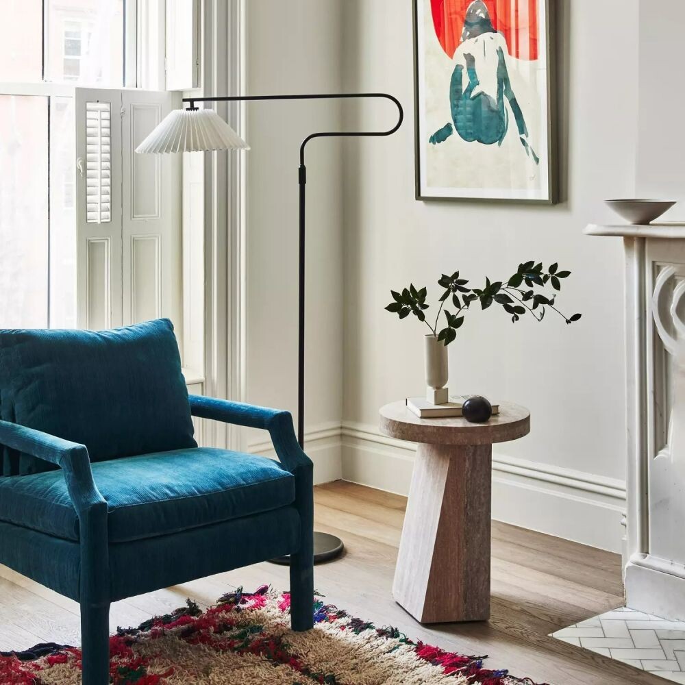 Лайфхак: если у вас красивые обои за диваном, не вешайте картину. Просто поставьте торшер с прозрачным проводом или вообще без провода.