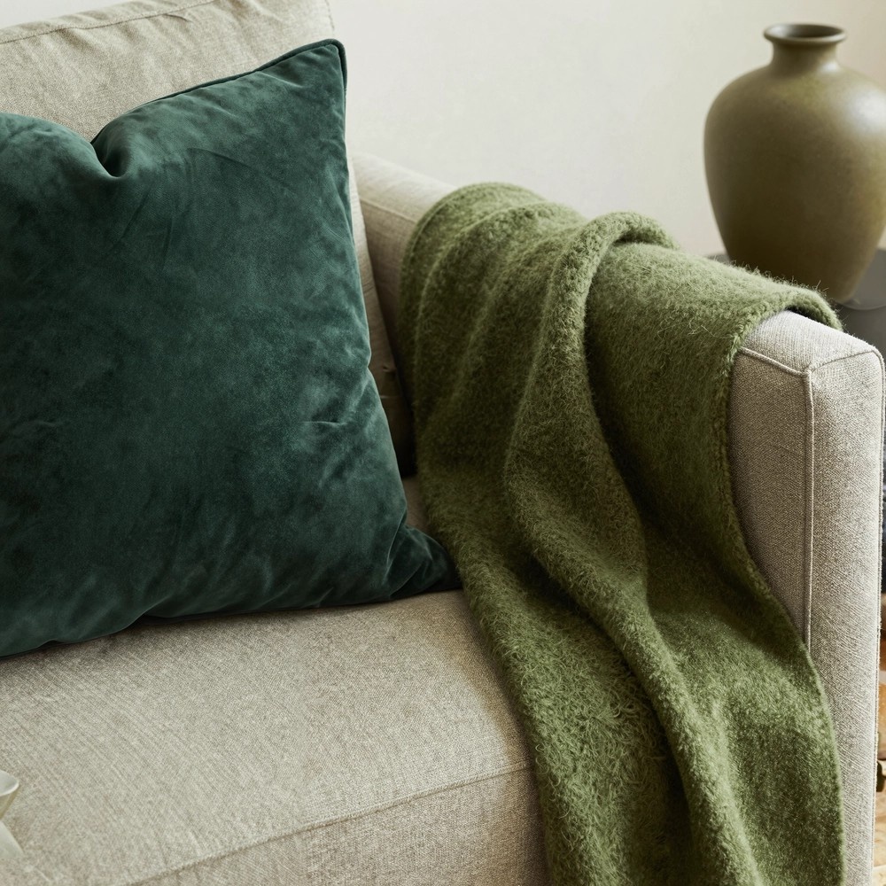 Это когда вся комната решена в одном цвете, но с разной насыщенностью. Стены — нежно-зелёные, диван — зелёный поглубже, подушки — оливковые, ковёр — цвета мха.