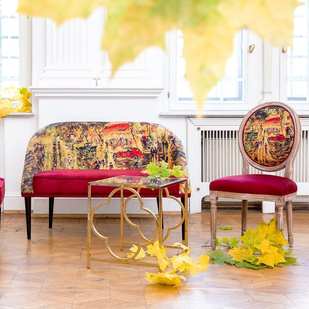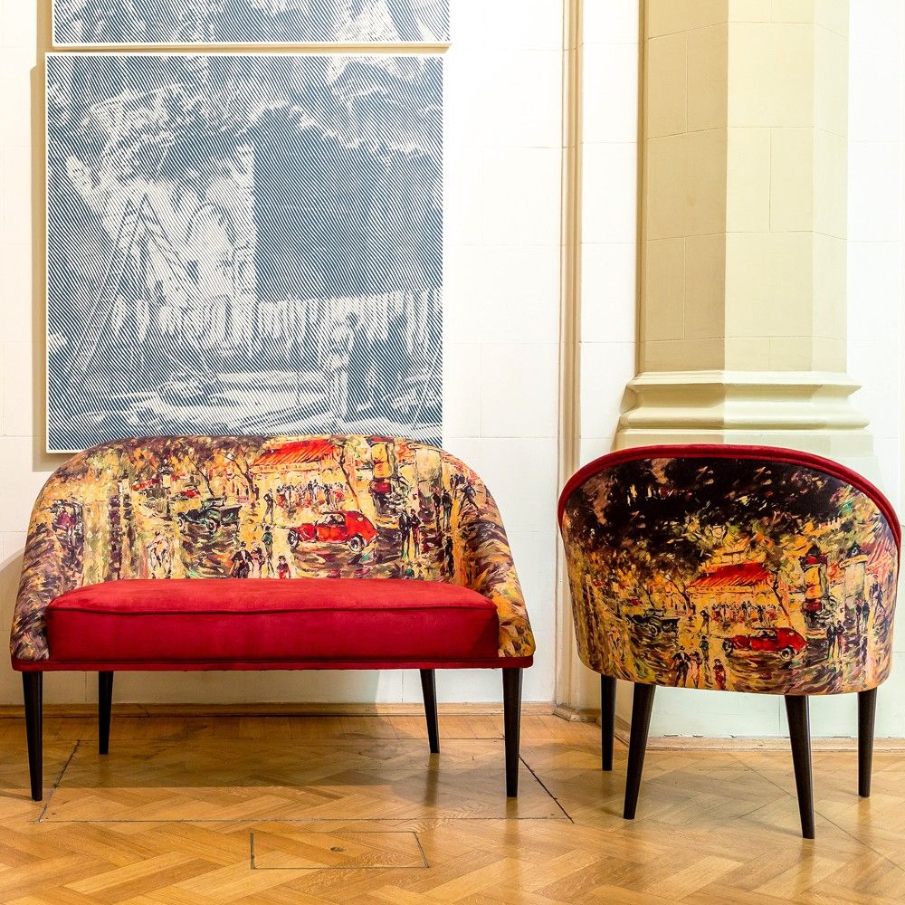 Минималистичный силуэт дивана гармонично впишется в современный интерьер, а живописная обивка с парижским пейзажем добавит ему романтичности и художественной ценности.