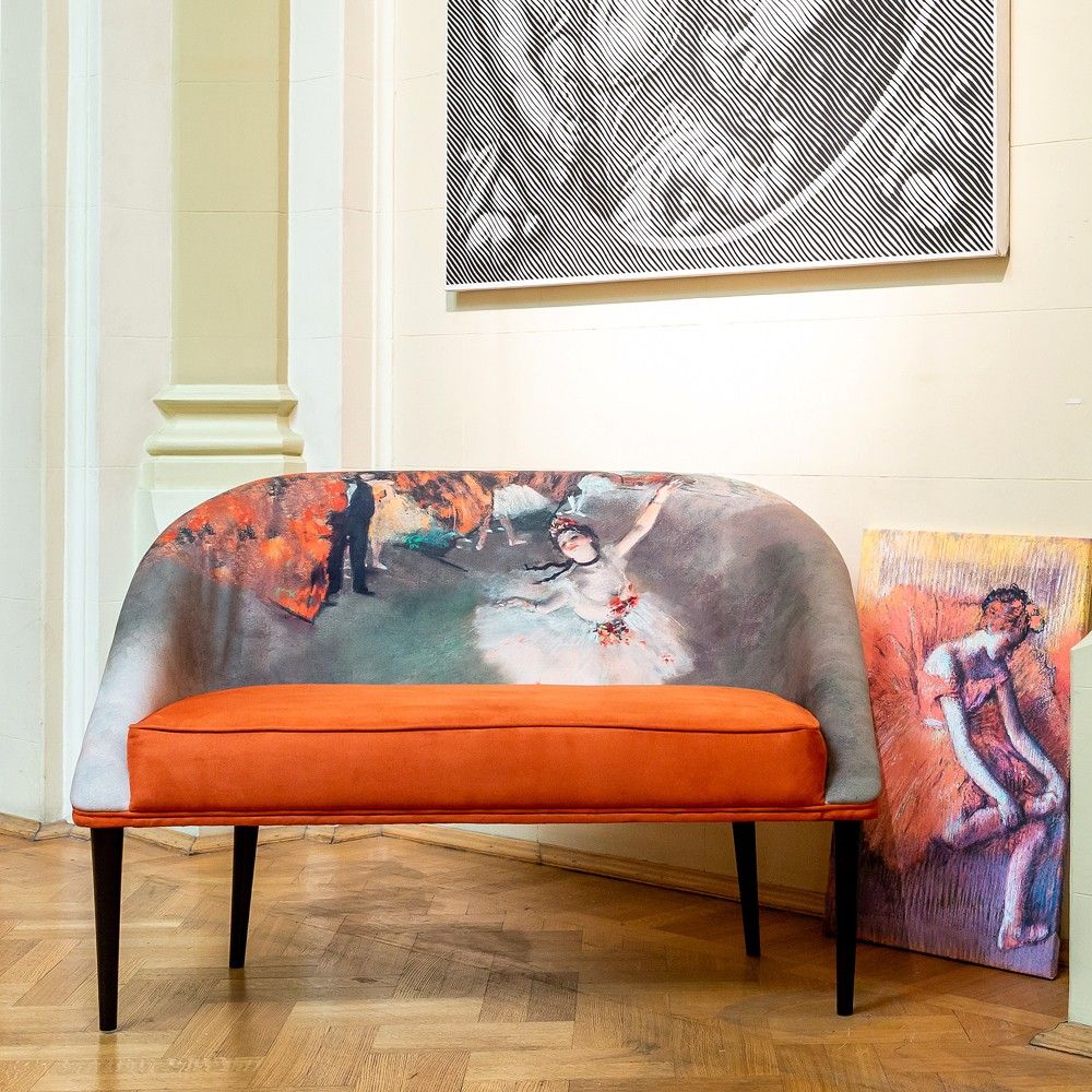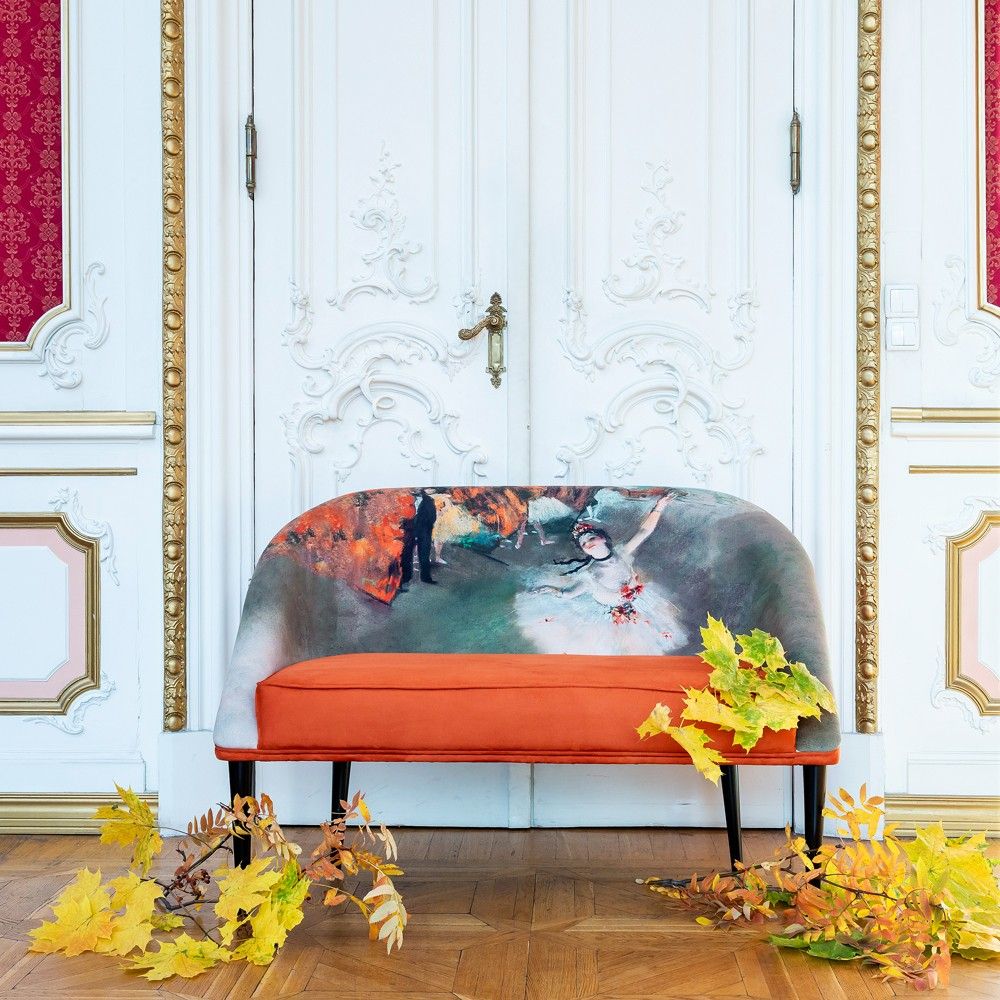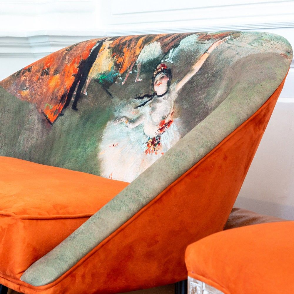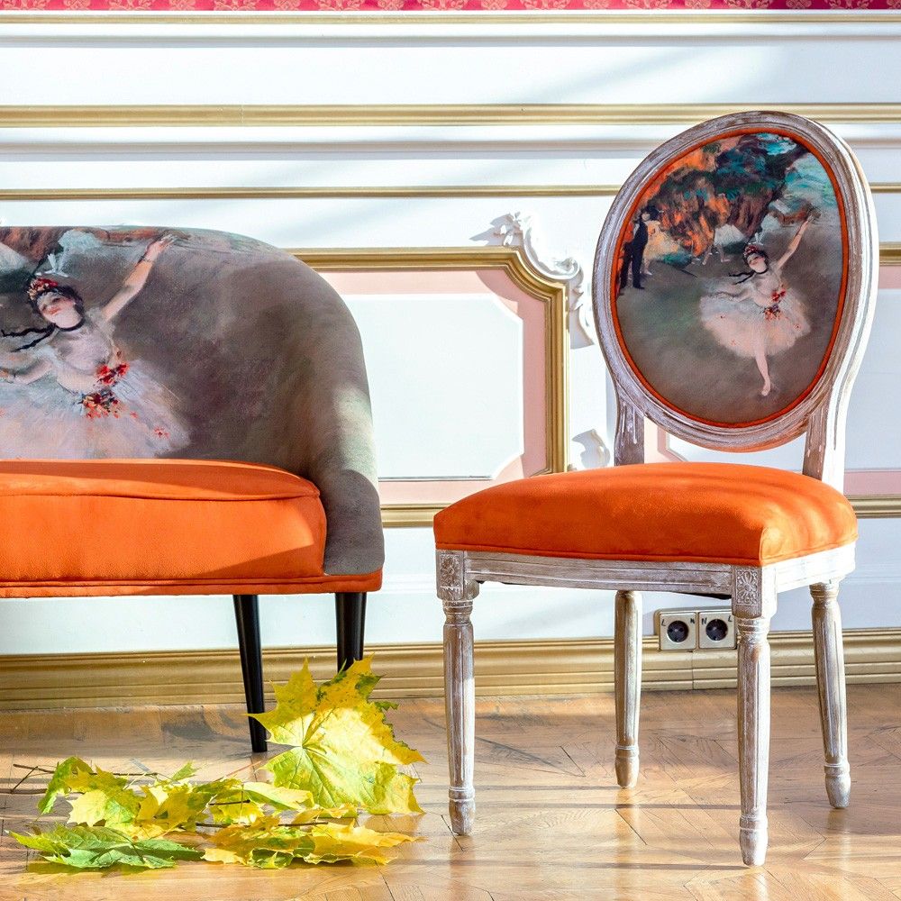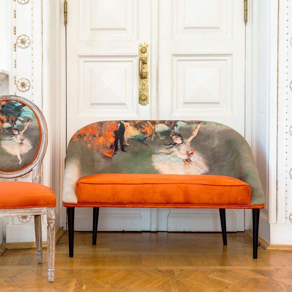 Источник вдохновения: Обивка повторяет сюжет и цветовую палитру шедевра Эдгара Дега «Звезда балета» (1878 г.) из музея Орсе. Землистые терракотовые и охристые оттенки обивки — трендовые цвета, добавляющие интерьеру тепла и страсти.