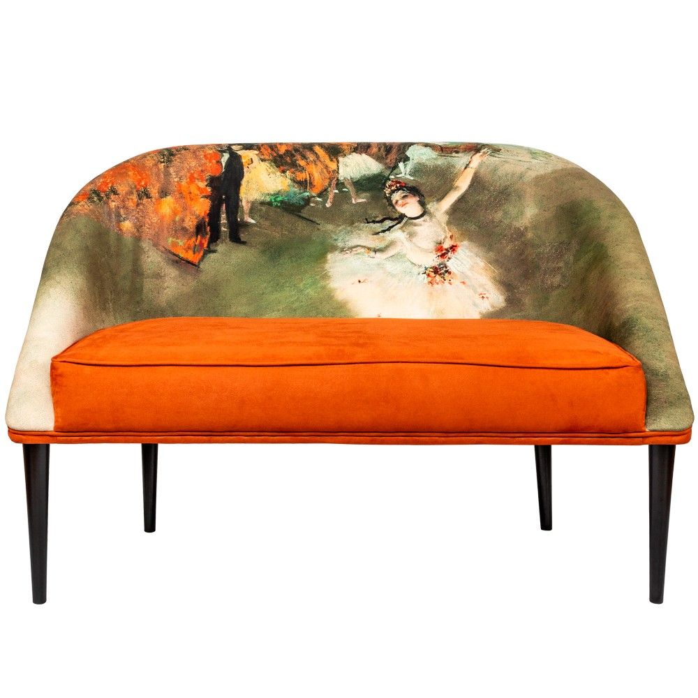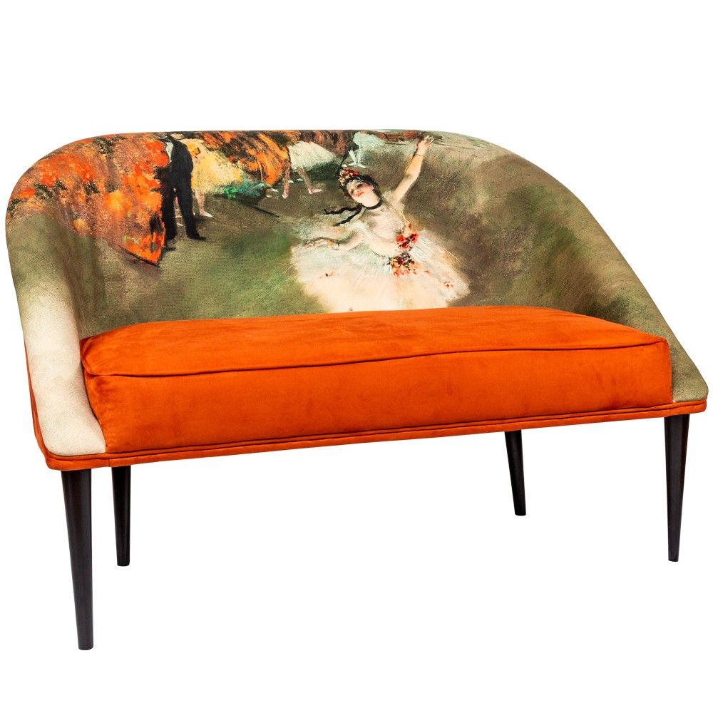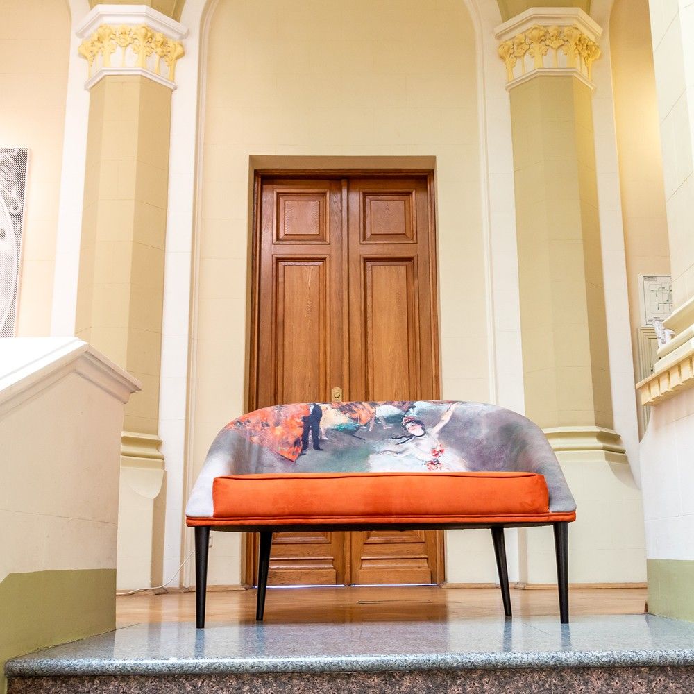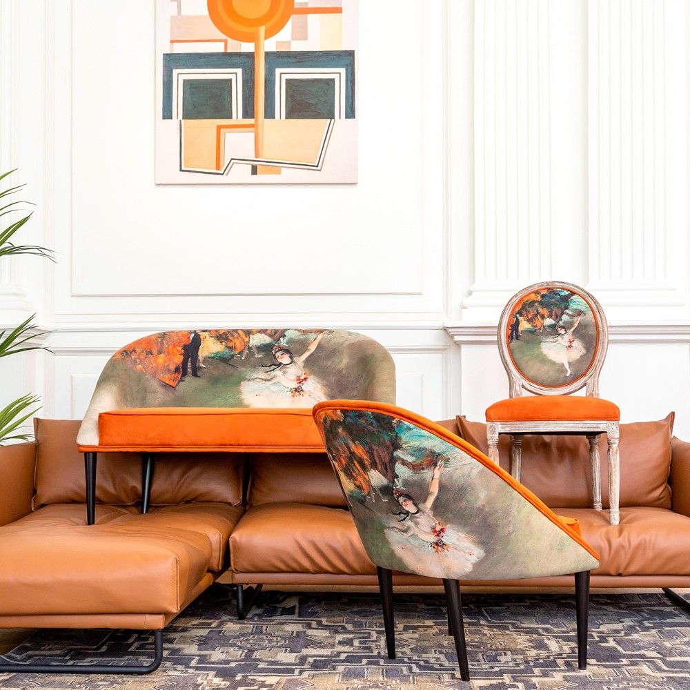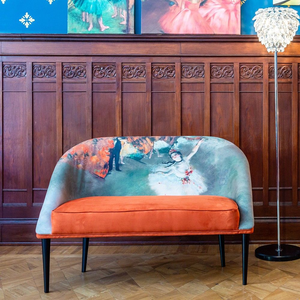 Источник вдохновения: Обивка повторяет сюжет и цветовую палитру шедевра Эдгара Дега «Звезда балета» (1878 г.) из музея Орсе. Землистые терракотовые и охристые оттенки обивки — трендовые цвета, добавляющие интерьеру тепла и страсти.