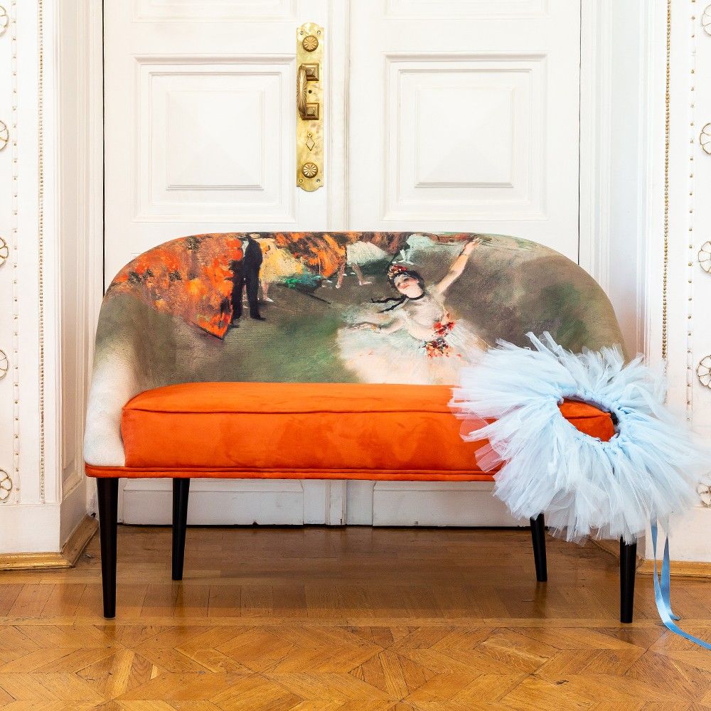 Этот диван — воплощение изящества и динамики. Он переносит на свою обивку магию балетной сцены, превращая привычный предмет мебели в главный акцент интерьера, наполненный театральностью, утонченностью и духом французского импрессионизма.