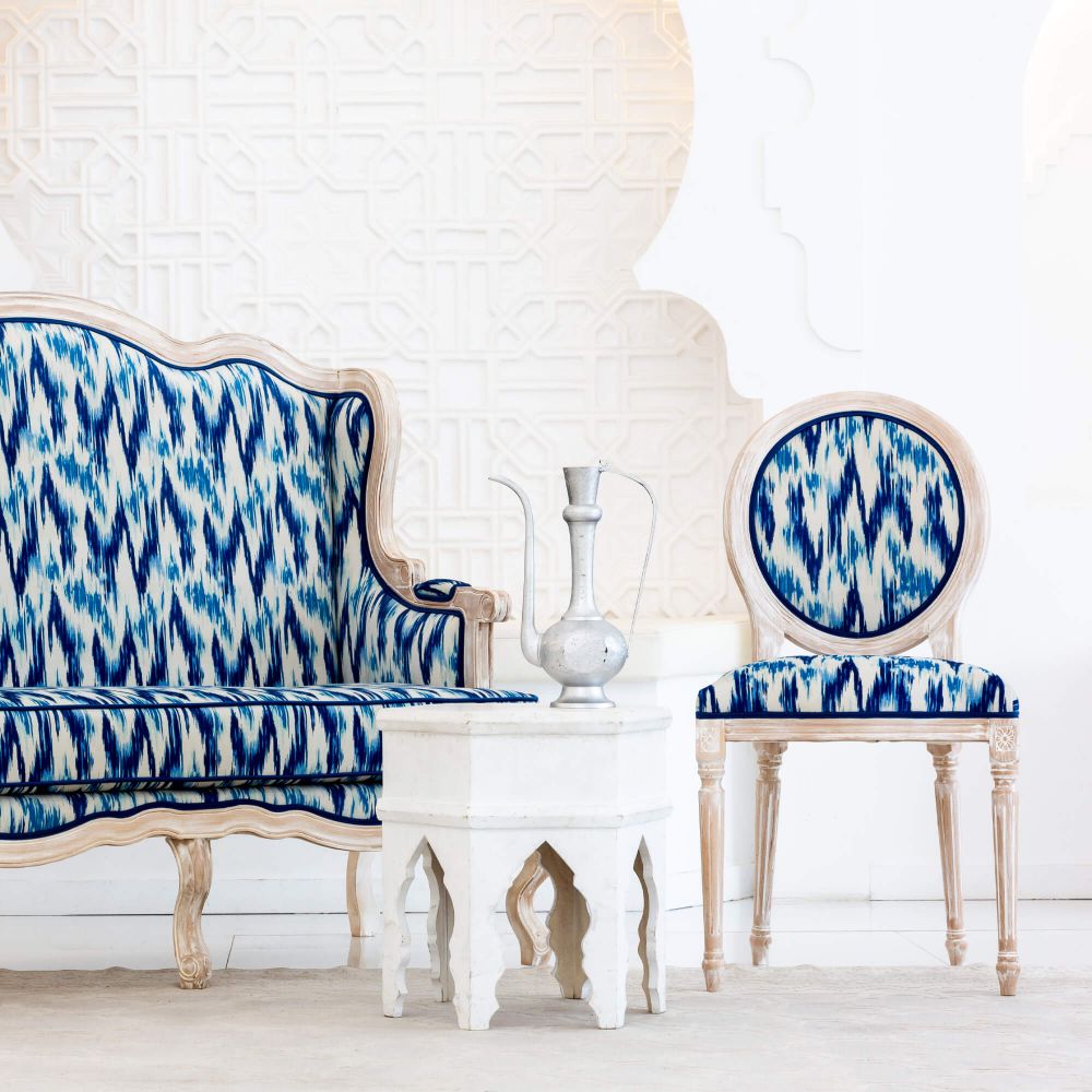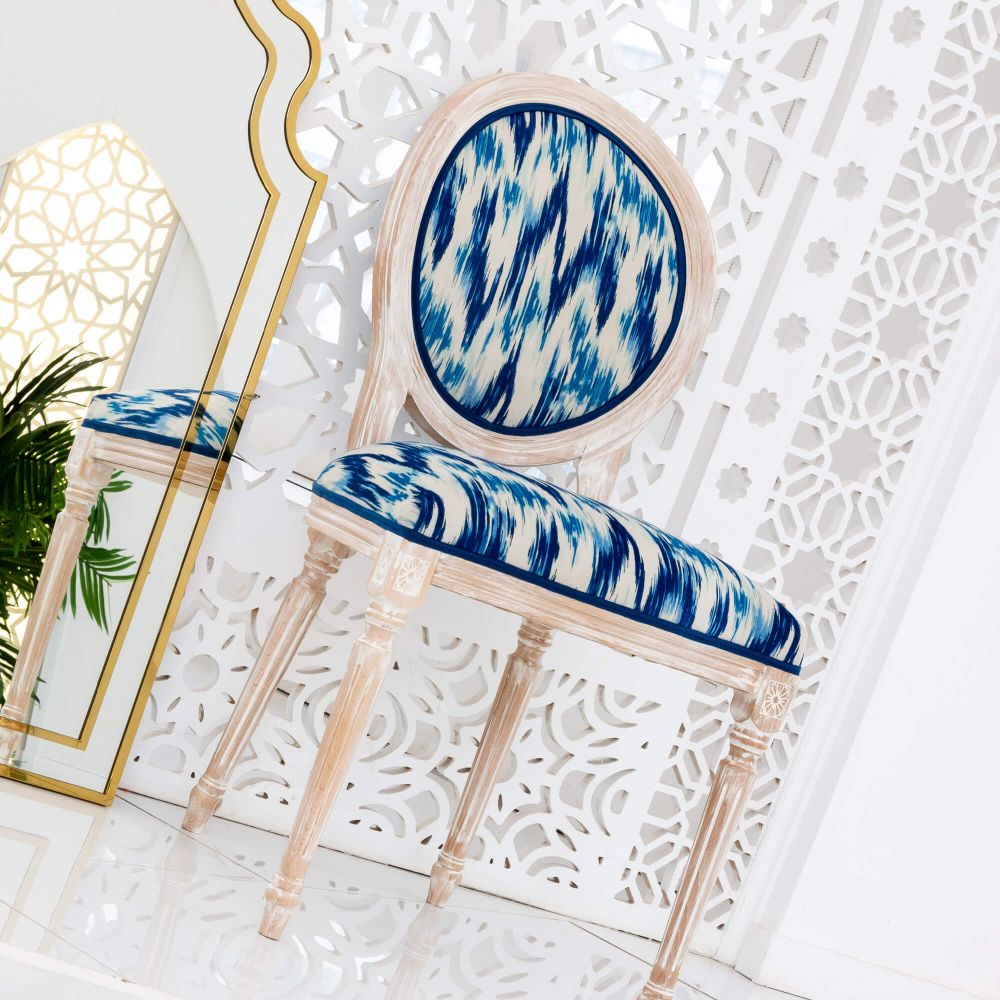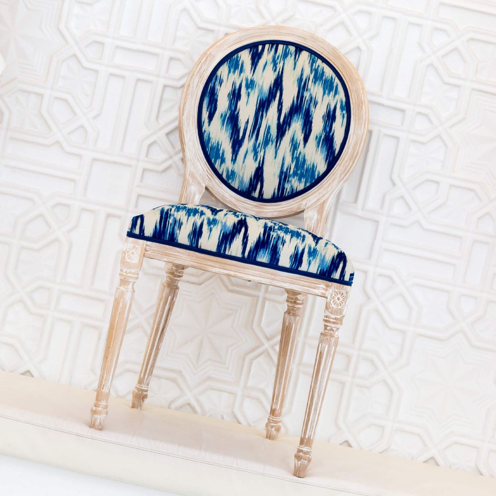 Если вы консерватор по сущности и не любите ничего менять, стул с орнаментом икат отлично вам подойдет. Этот узор по своему происхождению этнический, а это означает, что он будет уместен в оформлении классического стиля интерьера. Икат в синем цвете добавит вашему помещению особой элегантности. Этот цвет устраняет нервное напряжение, снимает усталость, даже нормализует кровяное давление. А еще синий – цвет спокойствия и удовлетворенности.