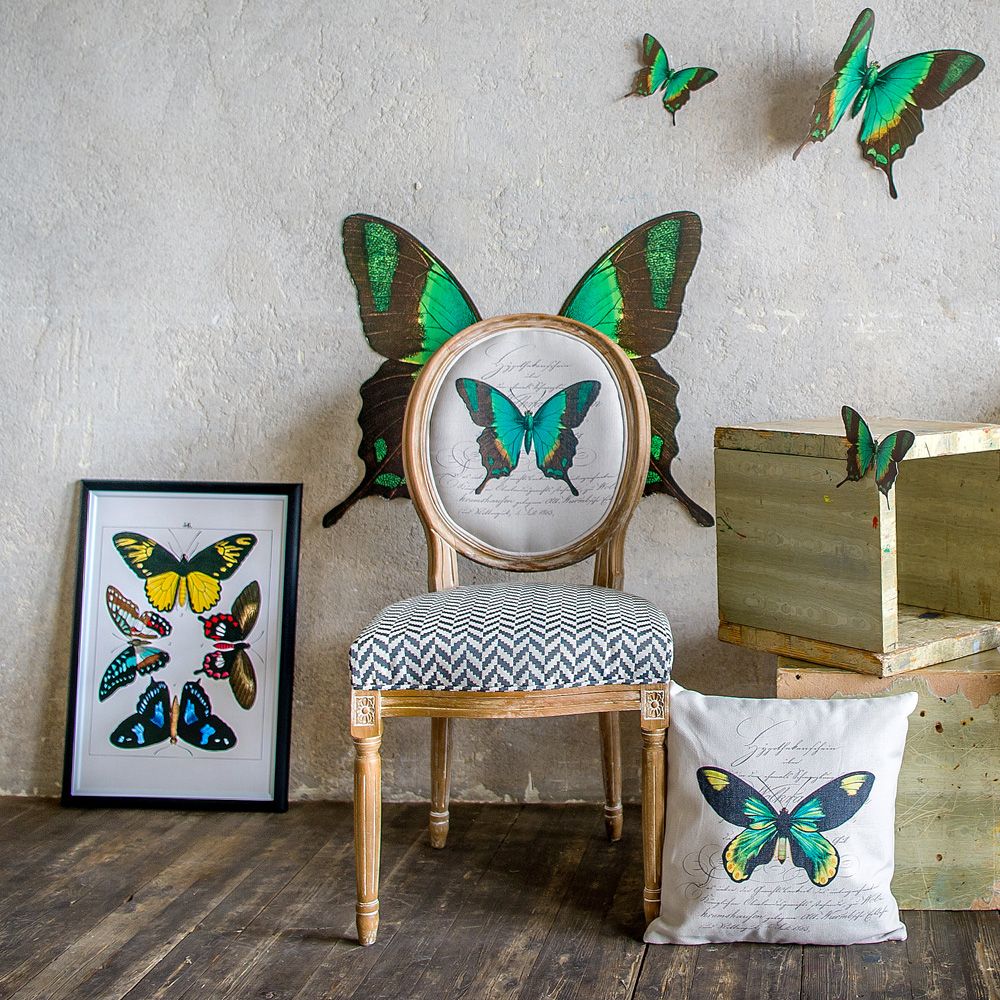 "Бабочки мира" - интерьерная коллекция, объединившая галерею мягких стульев и подушек, часов, картин и постеров, украшенных яркими расцветками экзотических бабочек. Повторив тему на разнообразных предметах интерьера, наслаждаемся коллекционным дизайном, созданным художником словно бы по нашему персональному заказу.