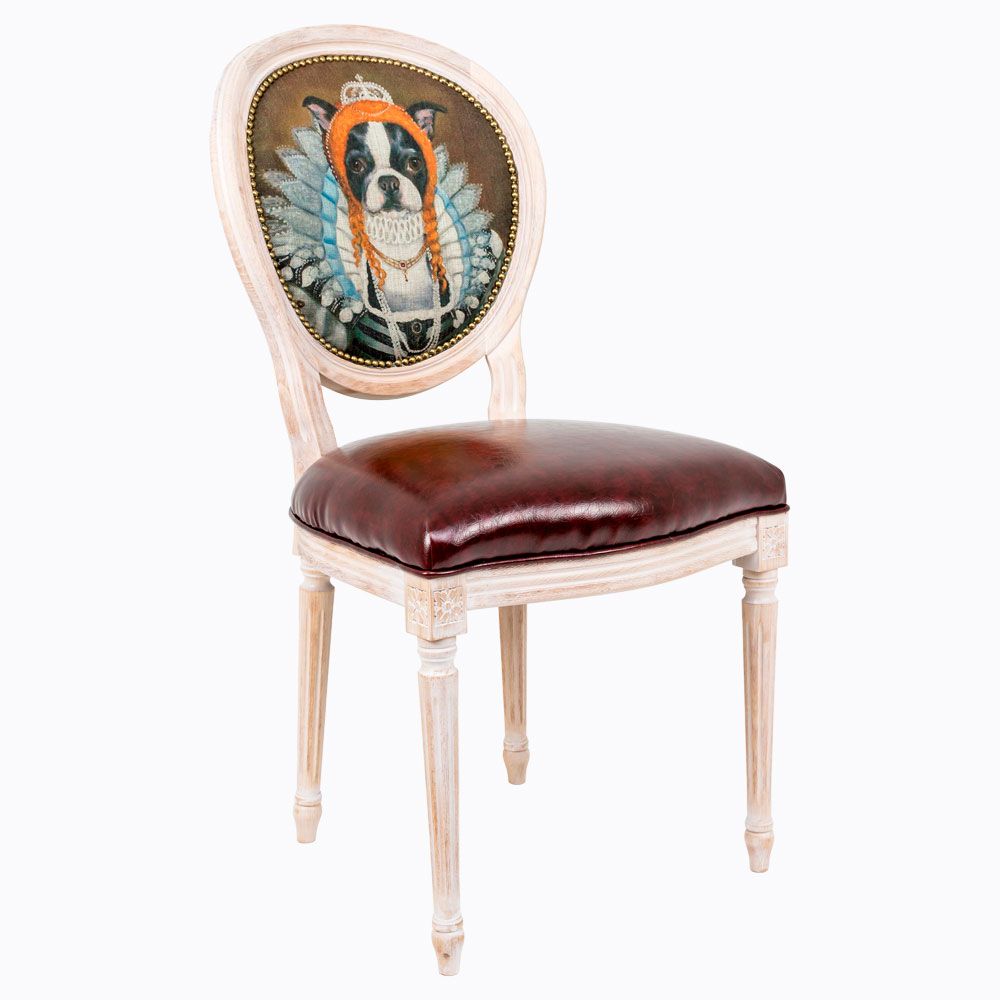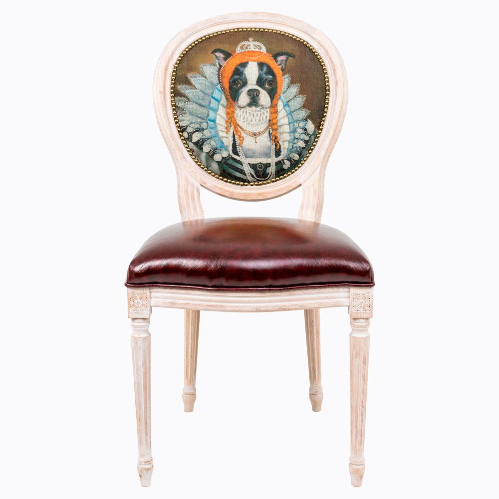 Стул "Музейный экспонат" - универсальное, но отборное решение гостиной и детской комнат, столовой, холла, кабинета и спальни. Анималистичные сюжеты находчиво имитируют костюмированные придворные интриги эпохи Возрождения. Особую пикантность создает эклектичное сочетание цветов и материалов. Шелковистая льняная спинка благородно оттеняет сочный глянец шоколадного сиденья, а статный дворцовый корпус эпохи Луи-Филиппа примеряет разноцветную палитру современного "фэнтези". Прототипом персонажа "Музейный экспонат" (версия 32) послужил портрет королевы Елизаветы Первой. Именно с её именем связан золотой век истории Англии. Елизавета стала последним представителем династии Тюдоров на престоле. Родилась в 1558 году, коронована в возрасте 25 лет. К тому времени Елизавета уже решила никогда не выходить замуж, поскольку поведение её отца сформировало своеобразное отношение девушки к мужчинам. В итоге Елизавета вошла в историю под уникальным псевдонимом королевы-девственницы.