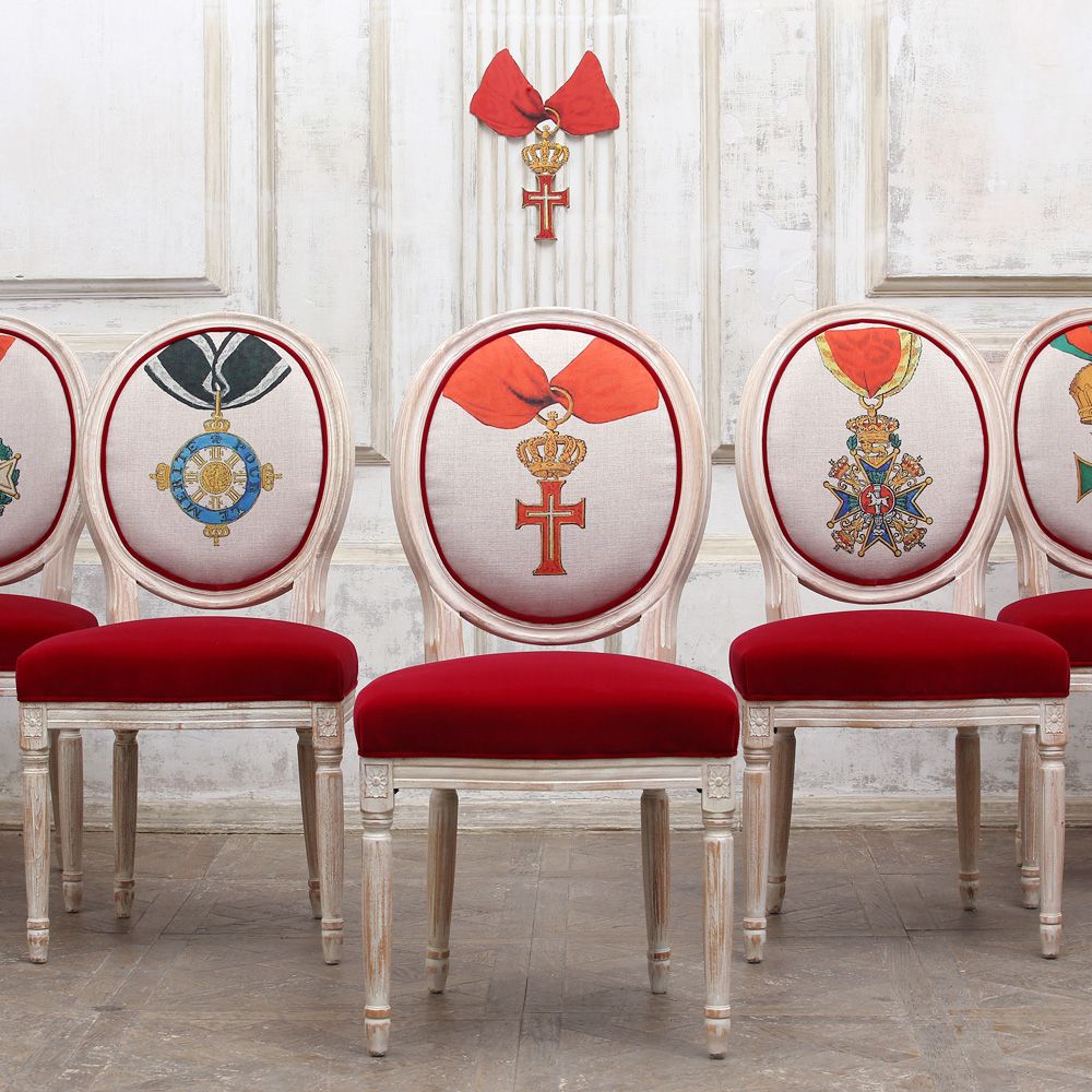 Коллекционную компанию стульям составит галерея декоративных подушек, повторяющих исторический сценарий стульев.