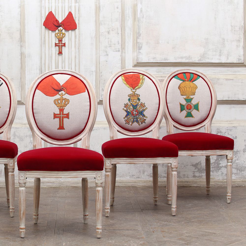 Коллекционную компанию стульям составит галерея декоративных подушек, повторяющих исторический сценарий стульев.