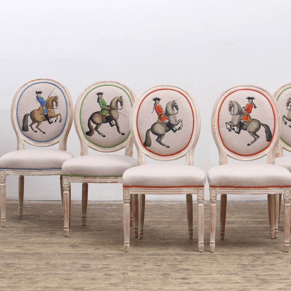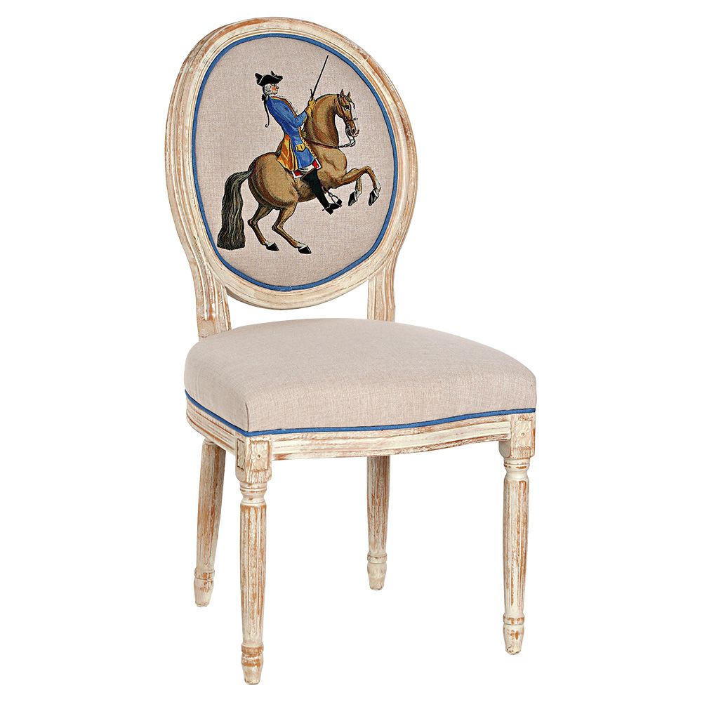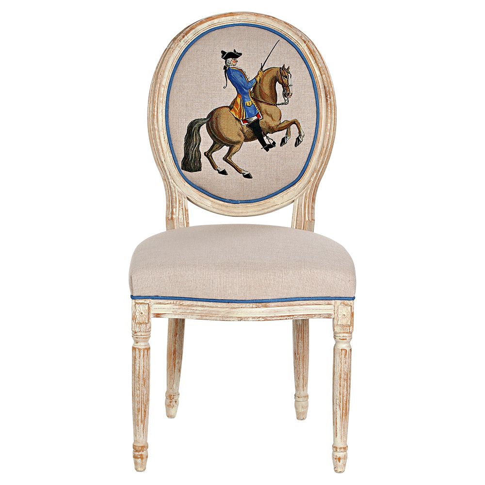 Кавалерист французской армии, изображенный на спинке стула "Верховая езда, Урок № 5", демонстрирует нам "курбет", - элемент высшей школы верховой езды.
