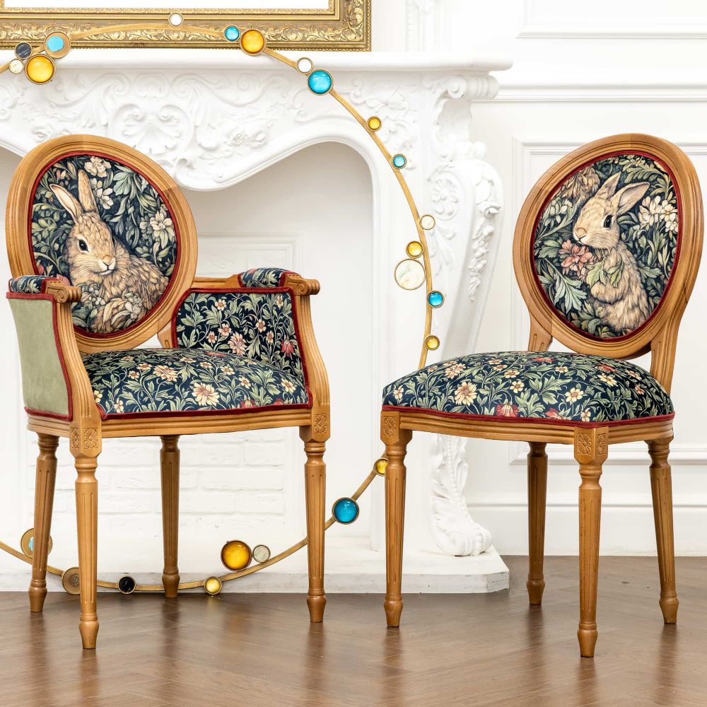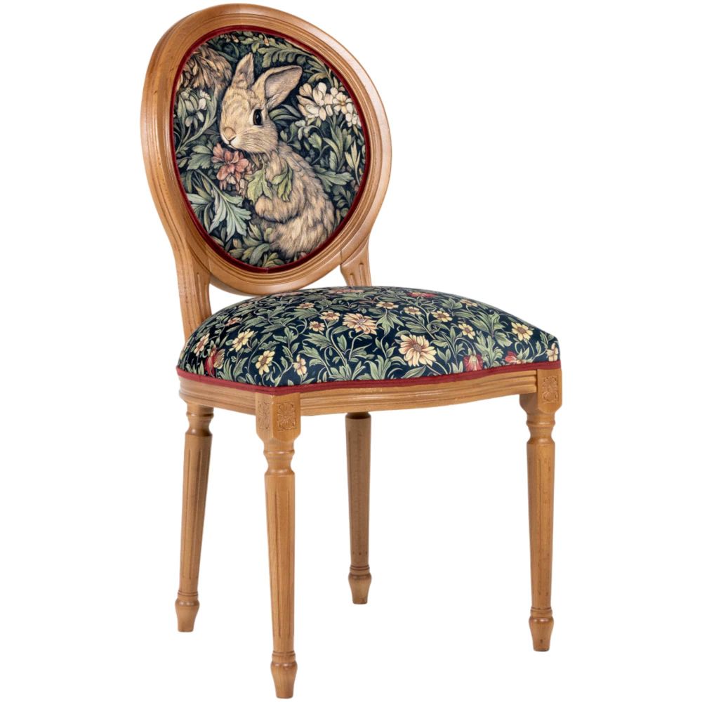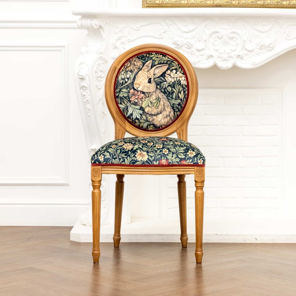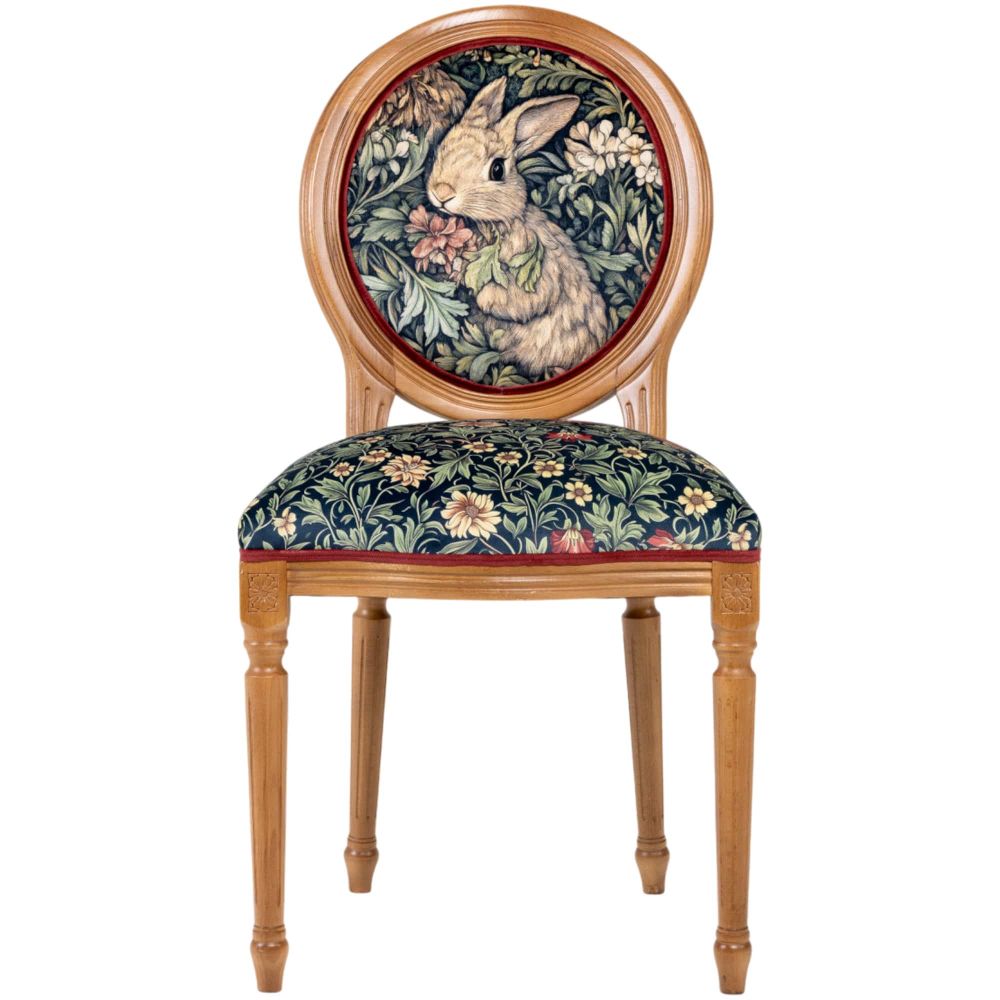 Стул «Бал сказок. Заяц» в стиле Уильяма Морриса – это изысканный предмет мебели, воплощающий в себе любовь к природе и декоративному искусству, характерные для творчества выдающегося английского дизайнера. Главной особенностью стула является уникальная обивка, украшающая его спинку и сиденье.