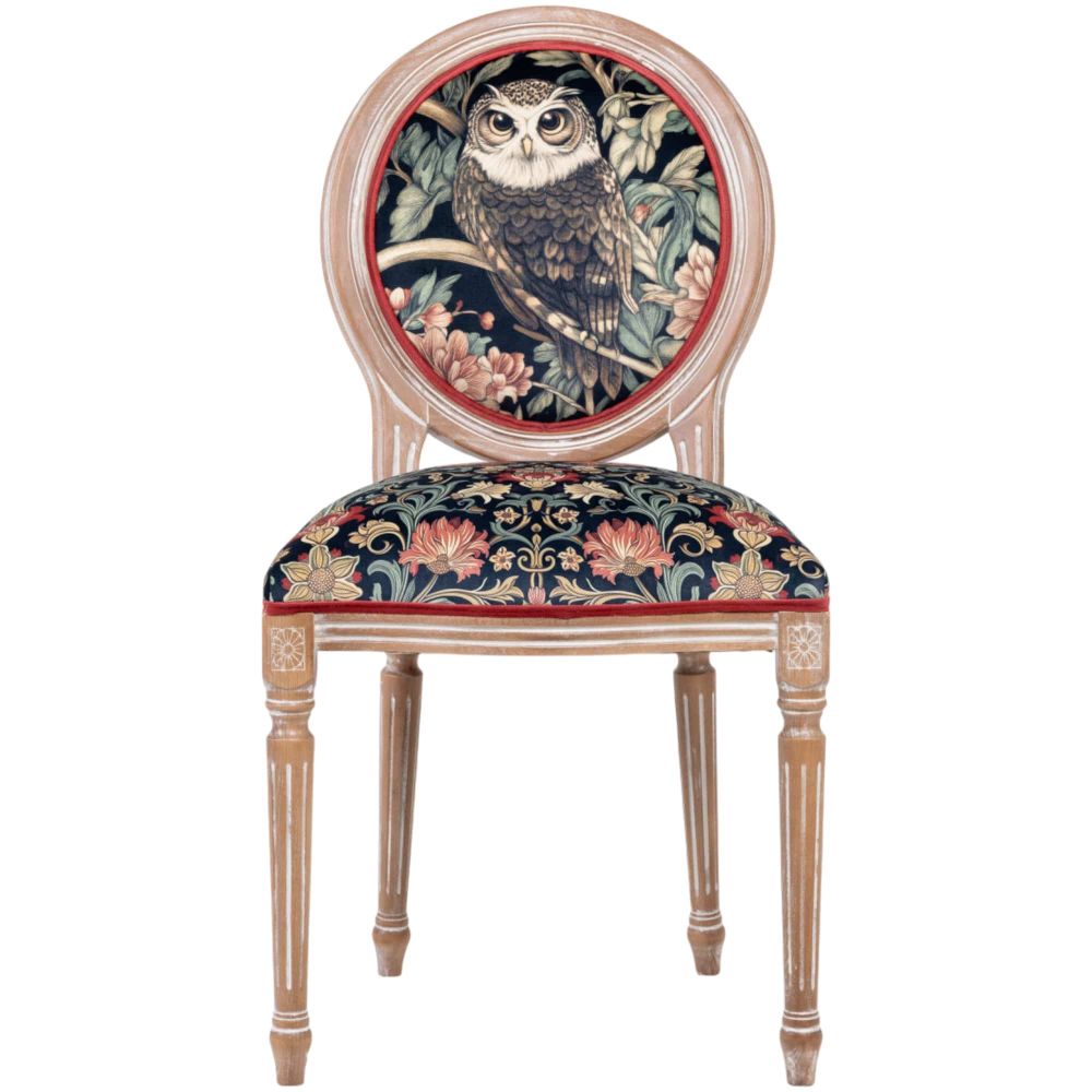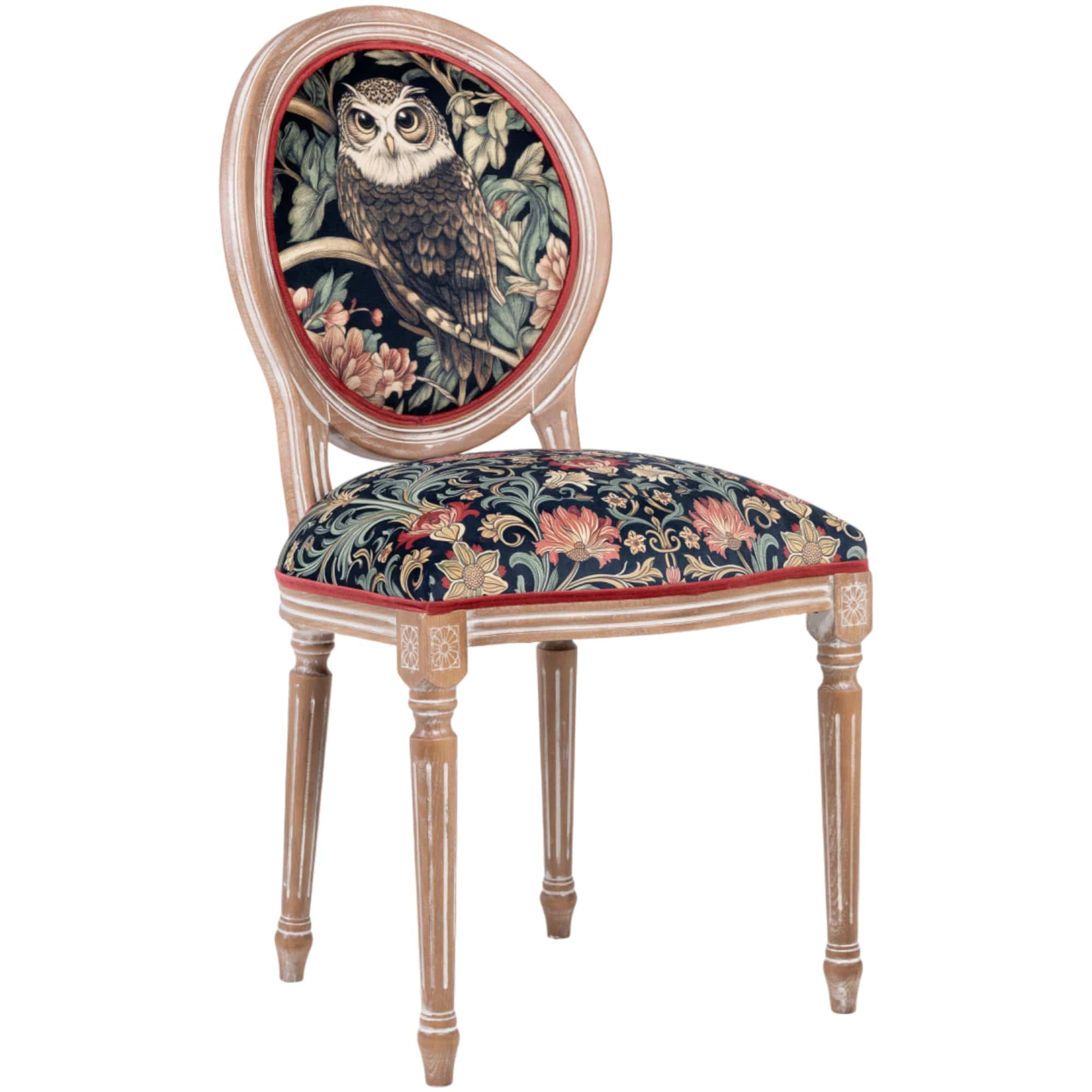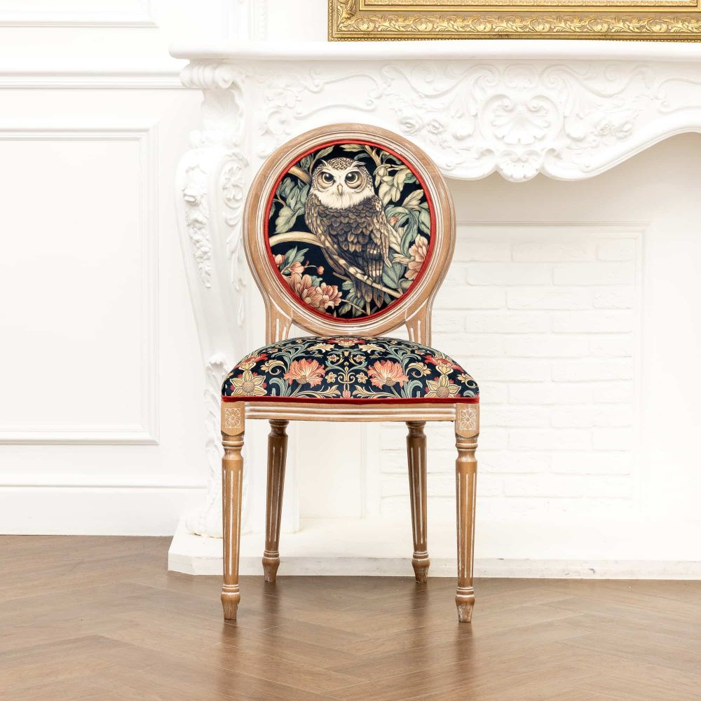 Стул «Бал Сказок. Сова» – это изысканное воплощение стиля Уильяма Морриса, где функциональность предмета интерьера сочетается с глубиной художественного образа. Главным акцентом является спинка стула, представляющая собой живописное полотно, на котором на черном, словно бархатном, фоне раскинулись ветви цветущего дерева. В самом центре этой композиции восседает мудрая сова, взгляд которой полон таинственности и знания.