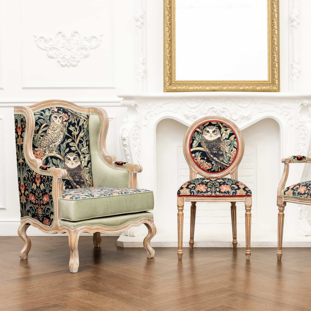 В обивке стула «Бал сказок. Сова» гармонично сочетаются контрастные элементы: глубокий черный фон, яркие цветочные мотивы, природная зелень и красный кант. Такое сочетание подчеркивает индивидуальность, гармонию и экологичность дизайна. Именно акцент на деталях делает этот стул выразительным элементом интерьера, способным рассказать историю. Он привлекает внимание, не перегружая пространство, а добавляя ему глубины и характера.