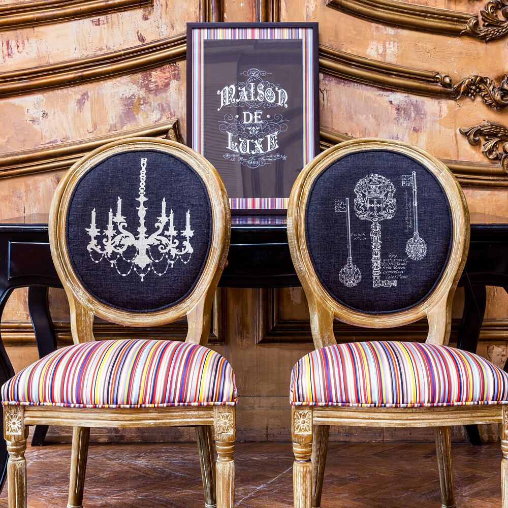Обивка стула изготовлена из “Тканей Солнца” французского дома Les Toiles du Soleil, - мирового лидера производства интерьерных тканей.