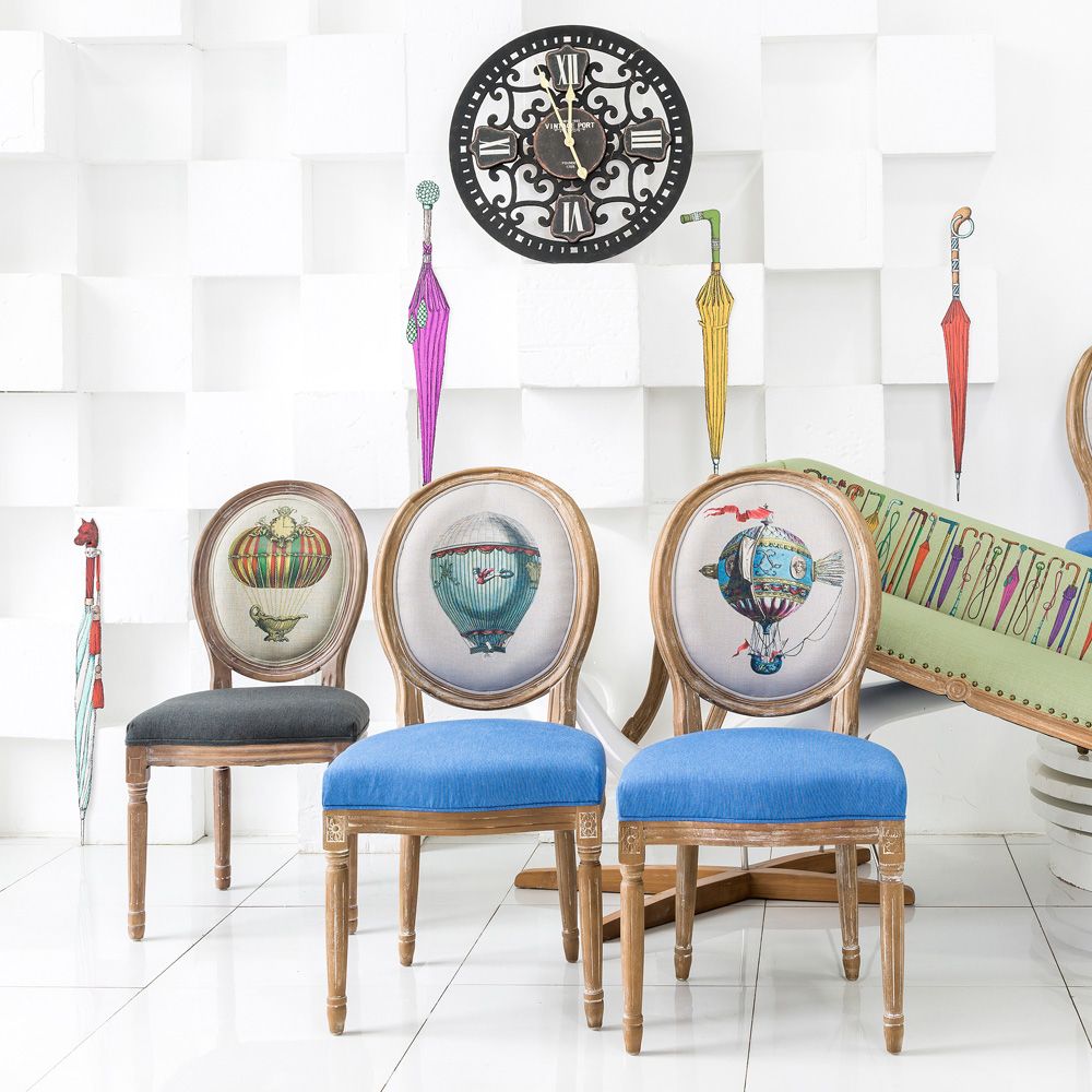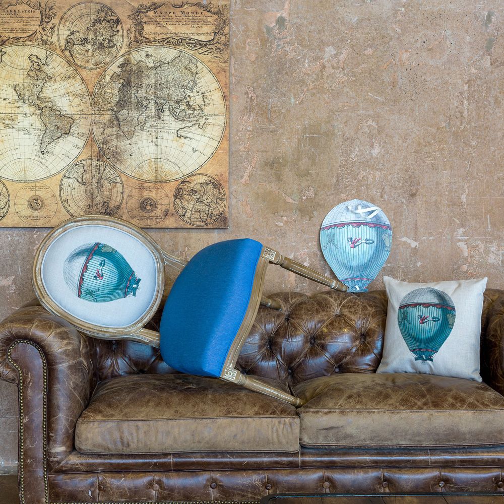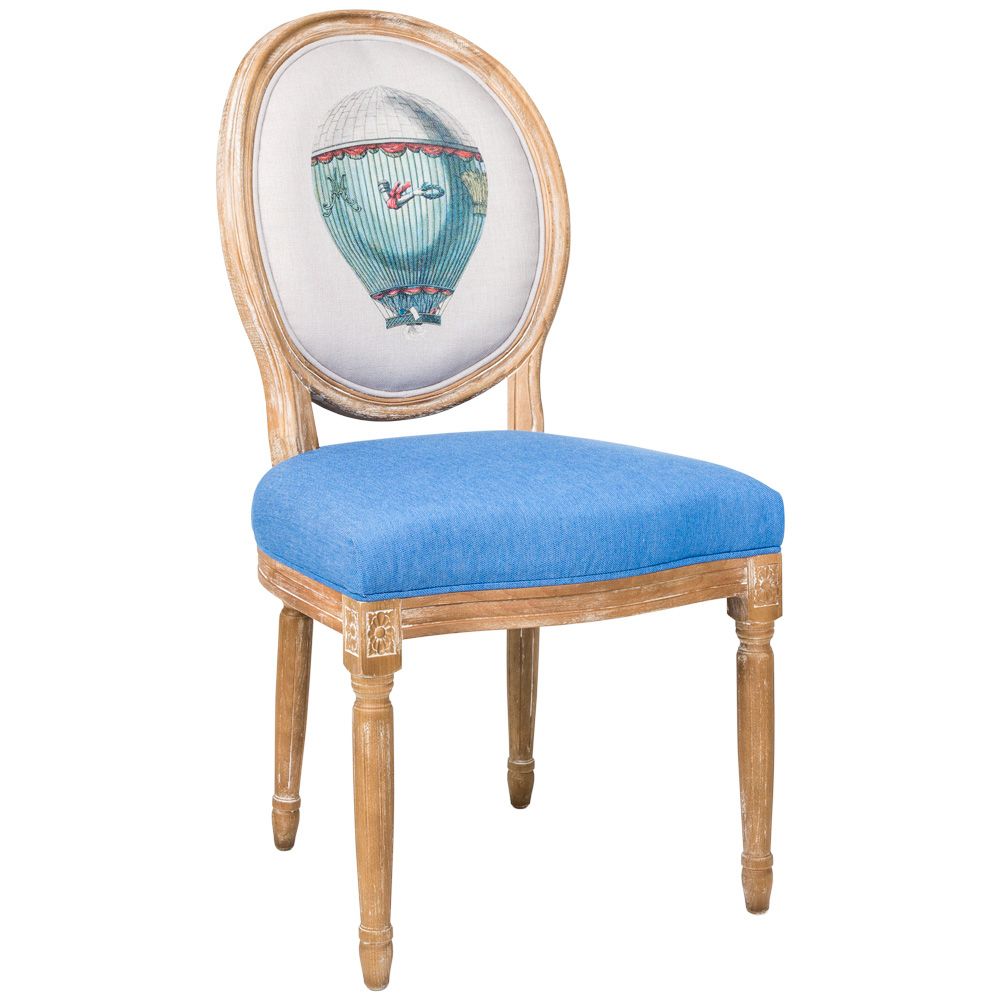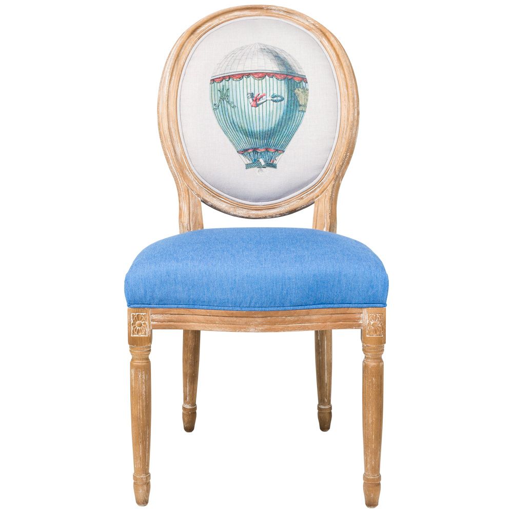 Спинку стула украсила историческая гравюра XVIII века, сохранившая грациозное убранство воздушного шара «Мария Антуанетта» («La Marie-Antoinette»), запущенного 23 июня 1784 года легендарным конструктором Жаном-Франсуа Пиларом де Розье (1754-1785) и химиком Луи-Жозефом Прустом. Их торжественный полет прошел в Версале в присутствии короля Людовика XVI и короля Швеции Густава III. Шар достиг высоты 3 000 метров и за 45 минут полета преодолел 52 километра, побив тем самым три мировых рекорда – расстояние, скорость и высоту.