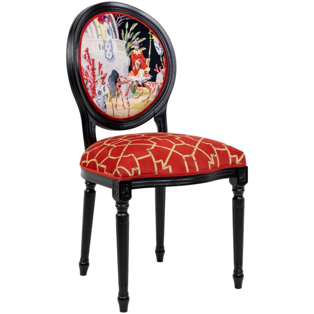Уникальное торговое предложение: Окно в сказку с двумя точками обзора. В отличие от обычных стульев, спинка «Ориентали» демонстрирует единый повествовательный сюжет с двух ракурсов: стремительное путешествие всадника на крабе и сцена ловли краба рыбаками, наблюдаемая с балкона подводного дворца. Это готовый концепт для интеллектуального интерьера.