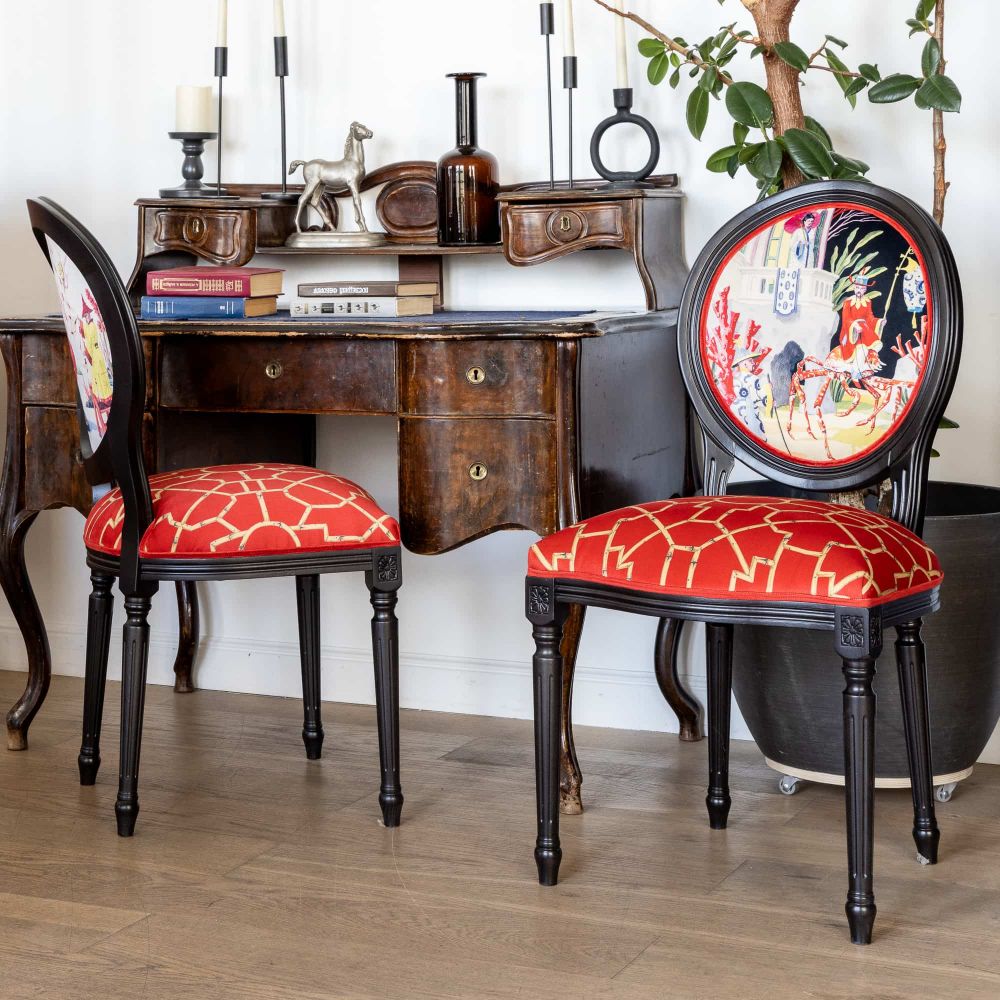 Цвет: Черный каркас, мультиколор обивки (насыщенный алый с геометрическим узором).