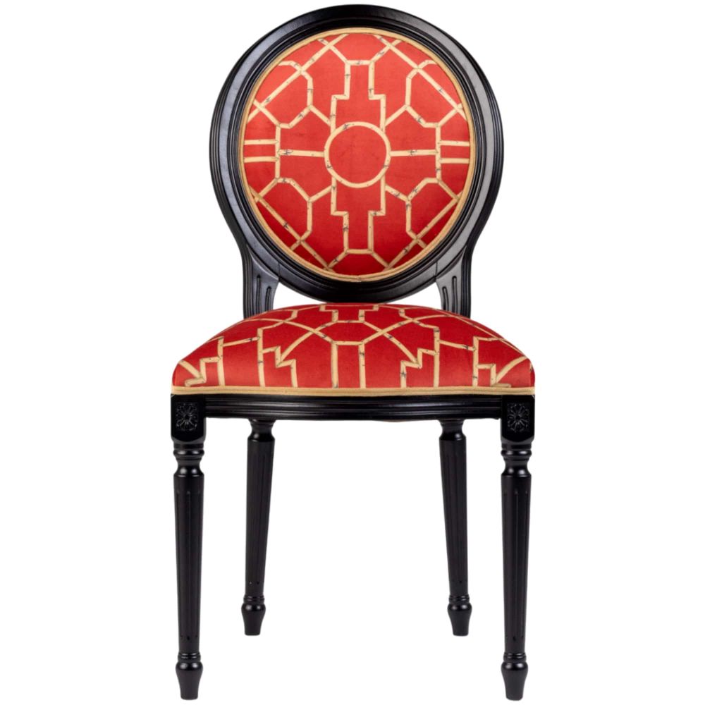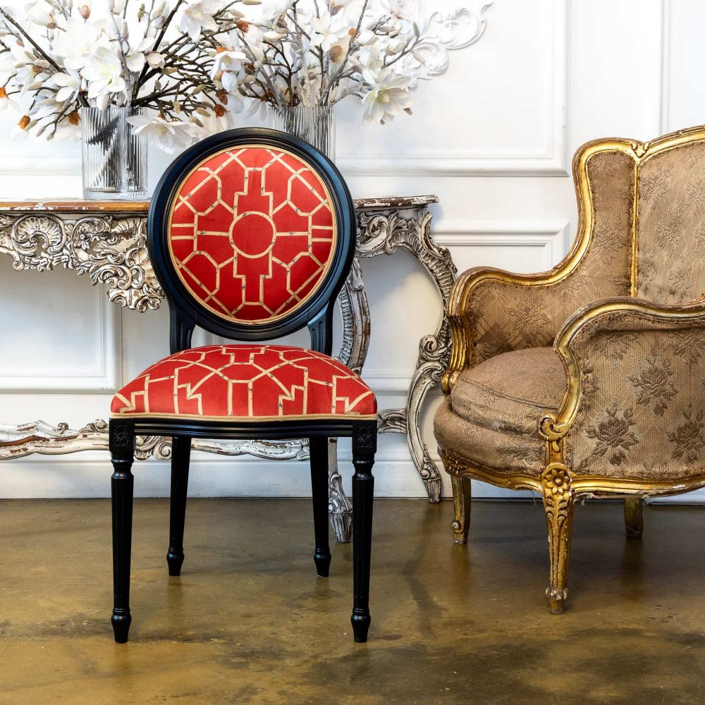 Обивка и декор: Сиденье обито практичным и приятным на ощупь мебельным микровелюром насыщенного алого цвета — одного из ключевых оттенков шинуазри, символизирующего удачу и процветание. Геометрический узор из стилизованных стеблей бамбука, выполненный в золотых тонах, добавляет ноту роскоши и отсылает к восточным мотивам. Тонкий горчичный кант смягчает контраст и добавляет теплый акцент.