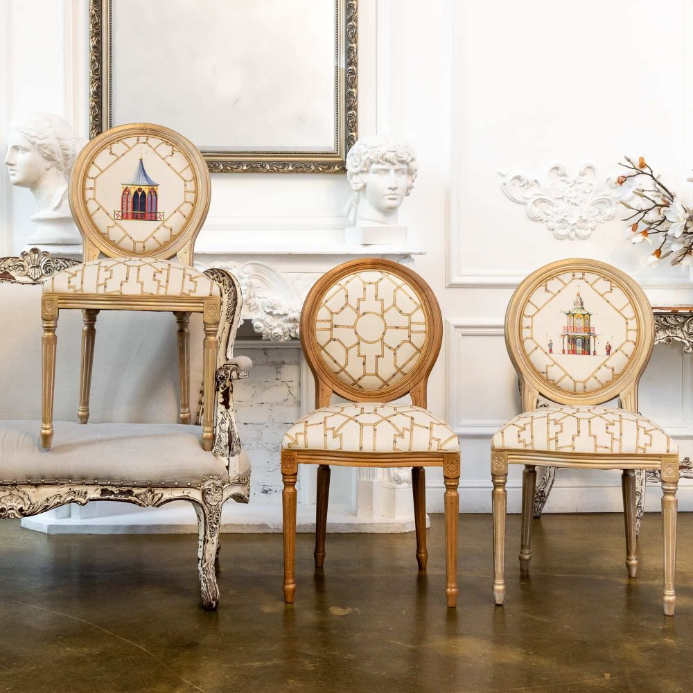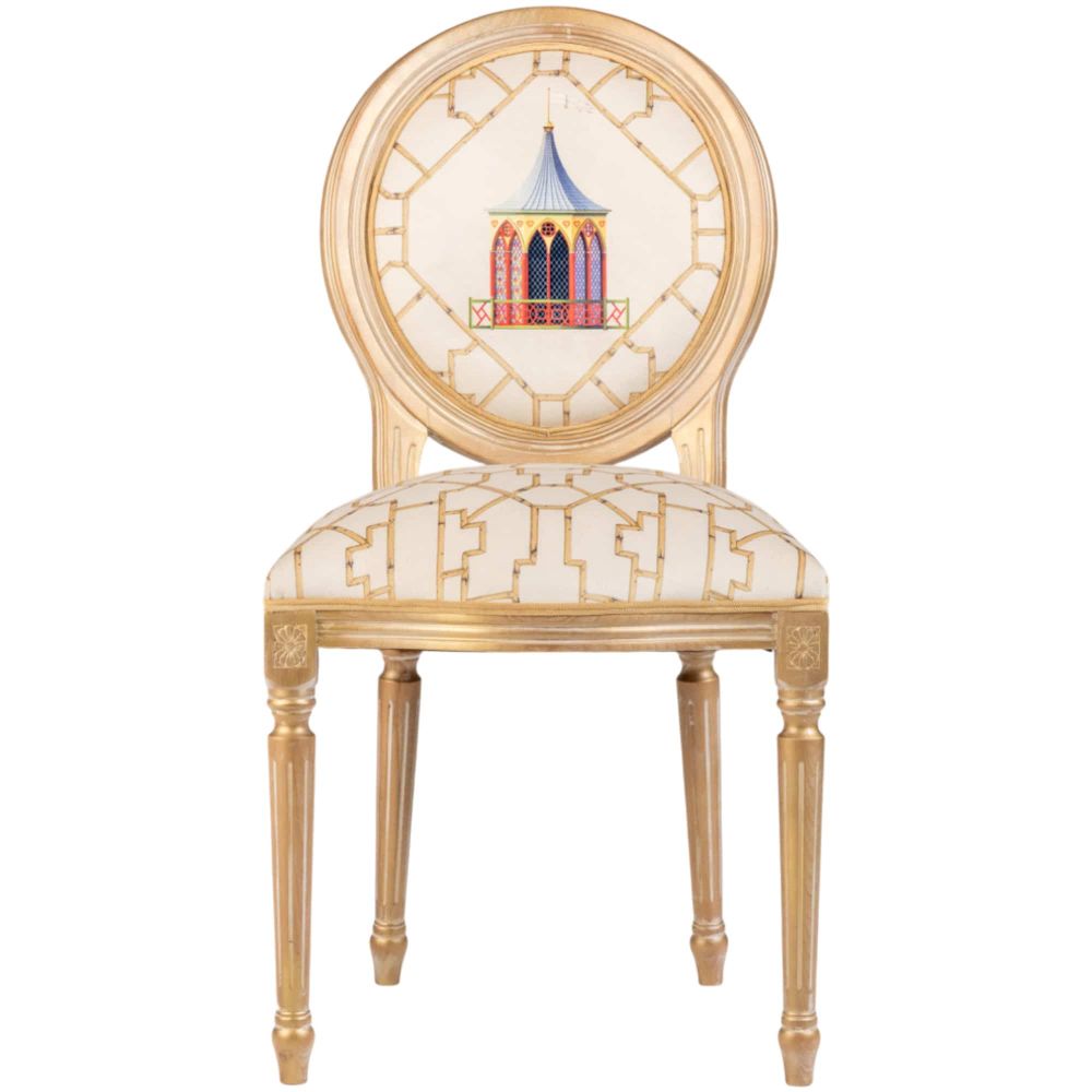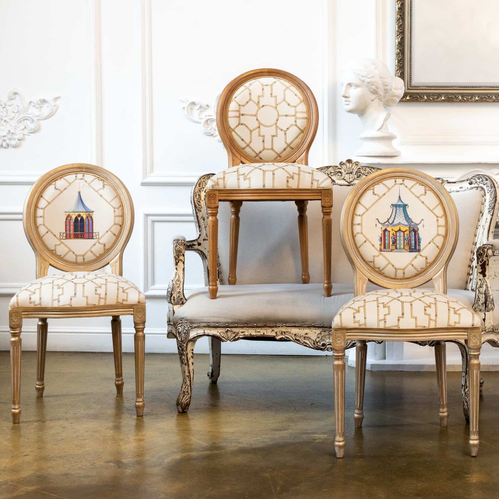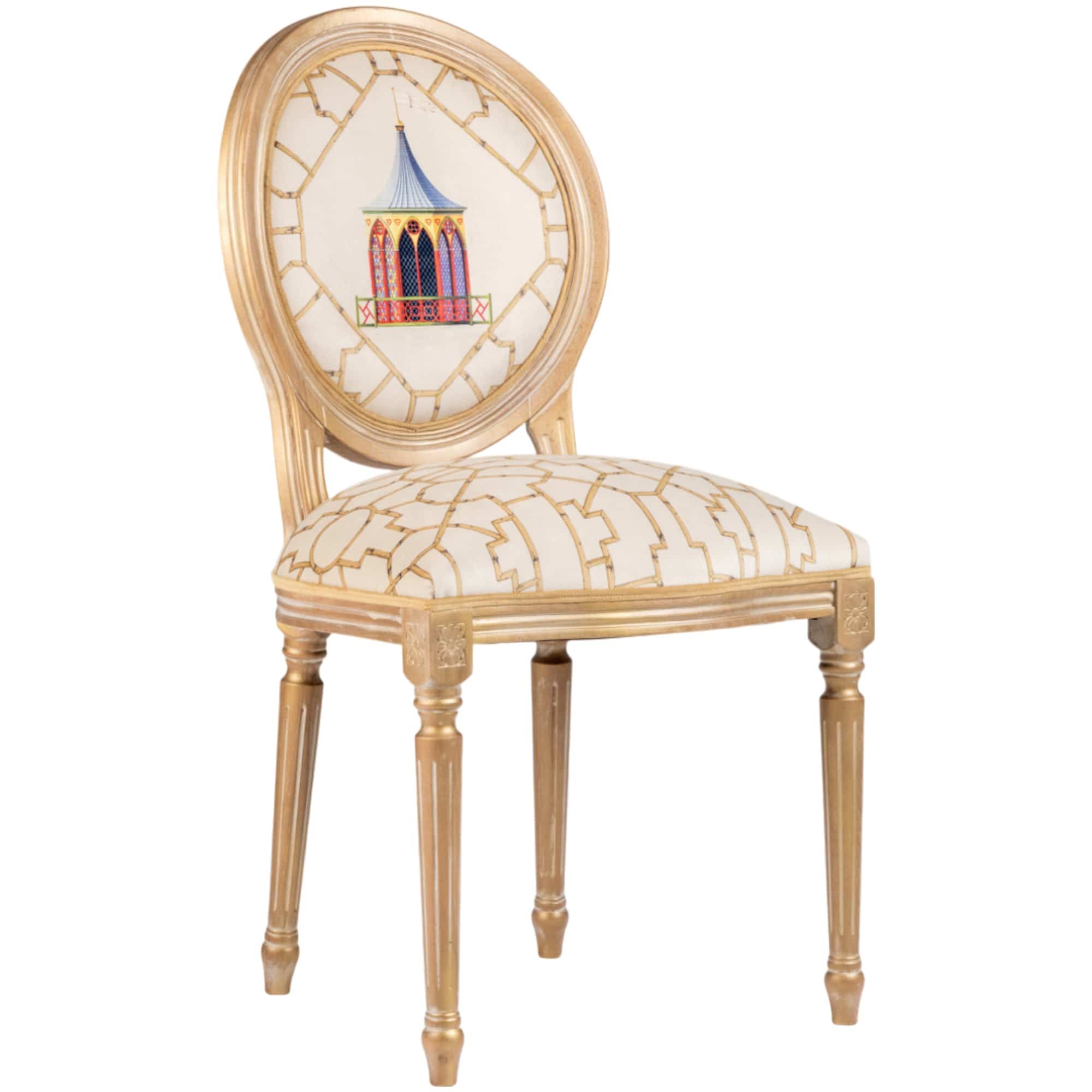 Эксклюзивный дизайн в стиле шинуазри: Главная ценность стула – уникальный авторский рисунок на спинке, изображающий изящную китайскую пагоду. Сводчатые окна, шпиль, ажурные решетки и растительные орнаменты переносят в атмосферу Дальнего Востока. Горчичная окантовка и геометричный принт «под бамбук» завершают образ, добавляя колорита и натуральности.