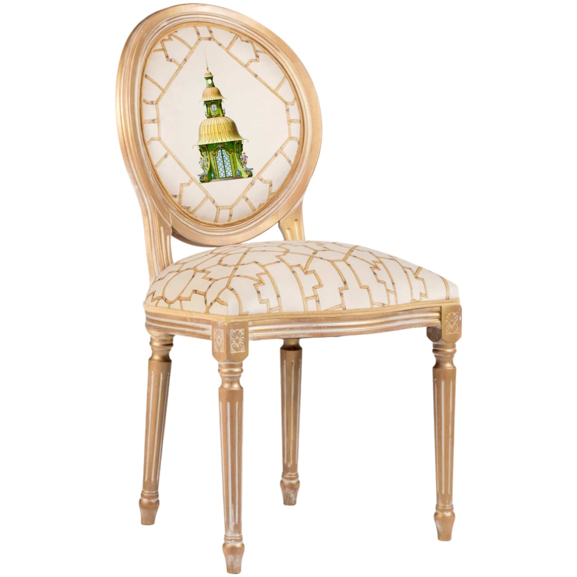 Прочный и благородный каркас: Основа стула изготовлена из массива натурального бука — одной из самых прочных европейских пород дерева. Изящные резные ножки в стиле Луи-Филиппа и корпус с отделкой лаком и благородной золотой патиной придают предмету аристократический шик и винтажный шарм.