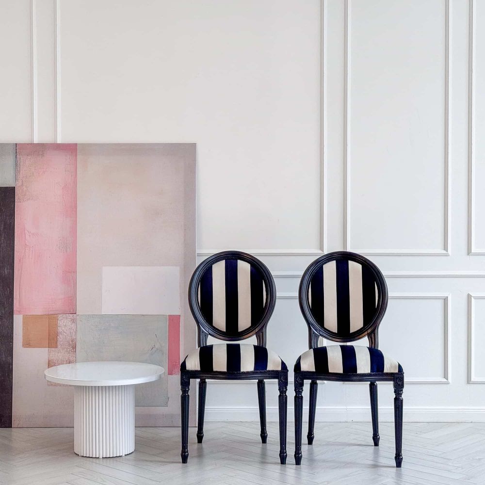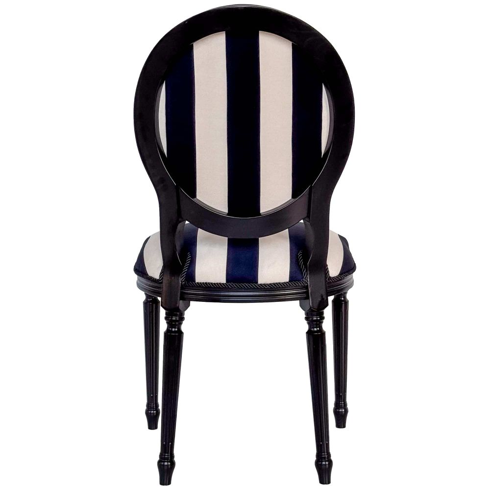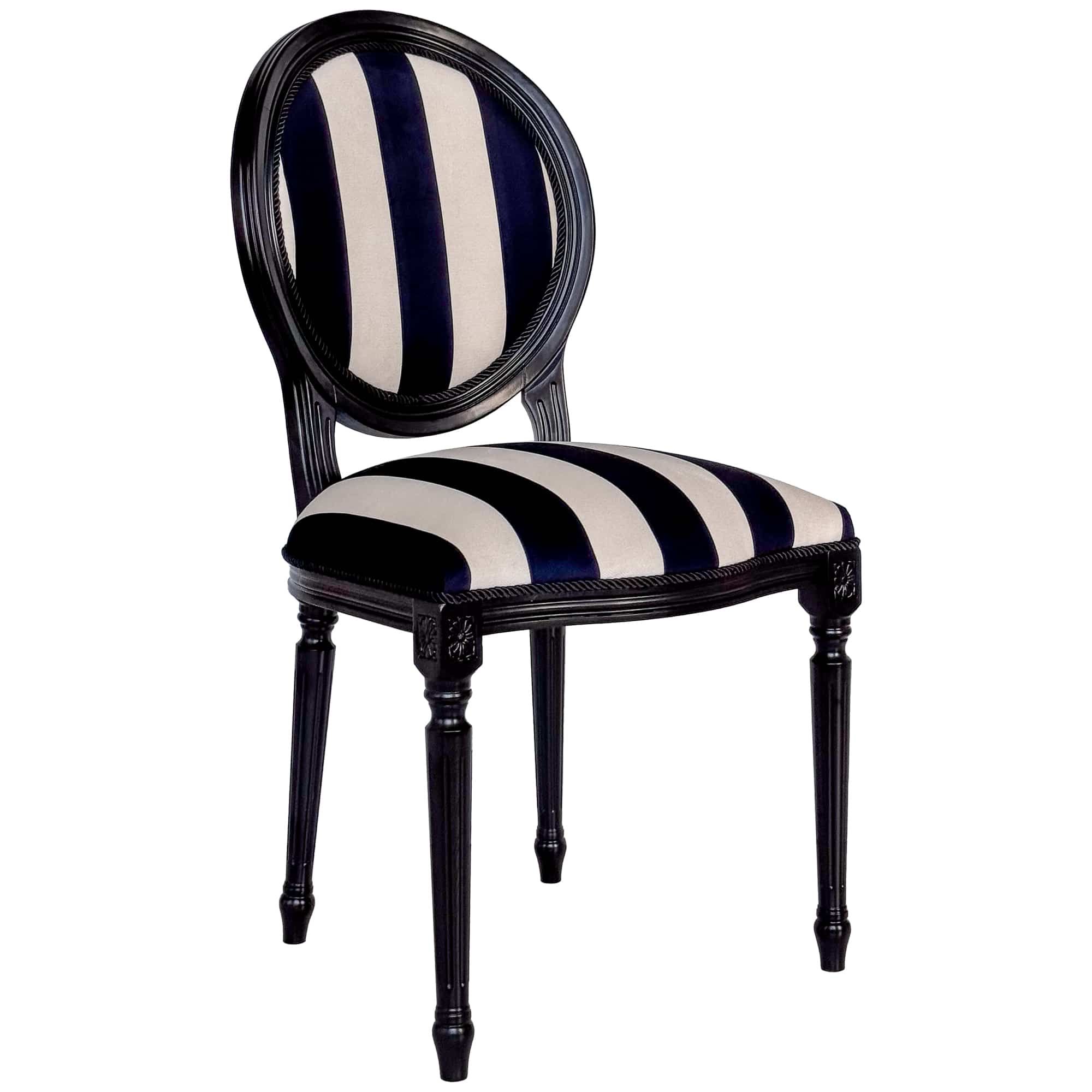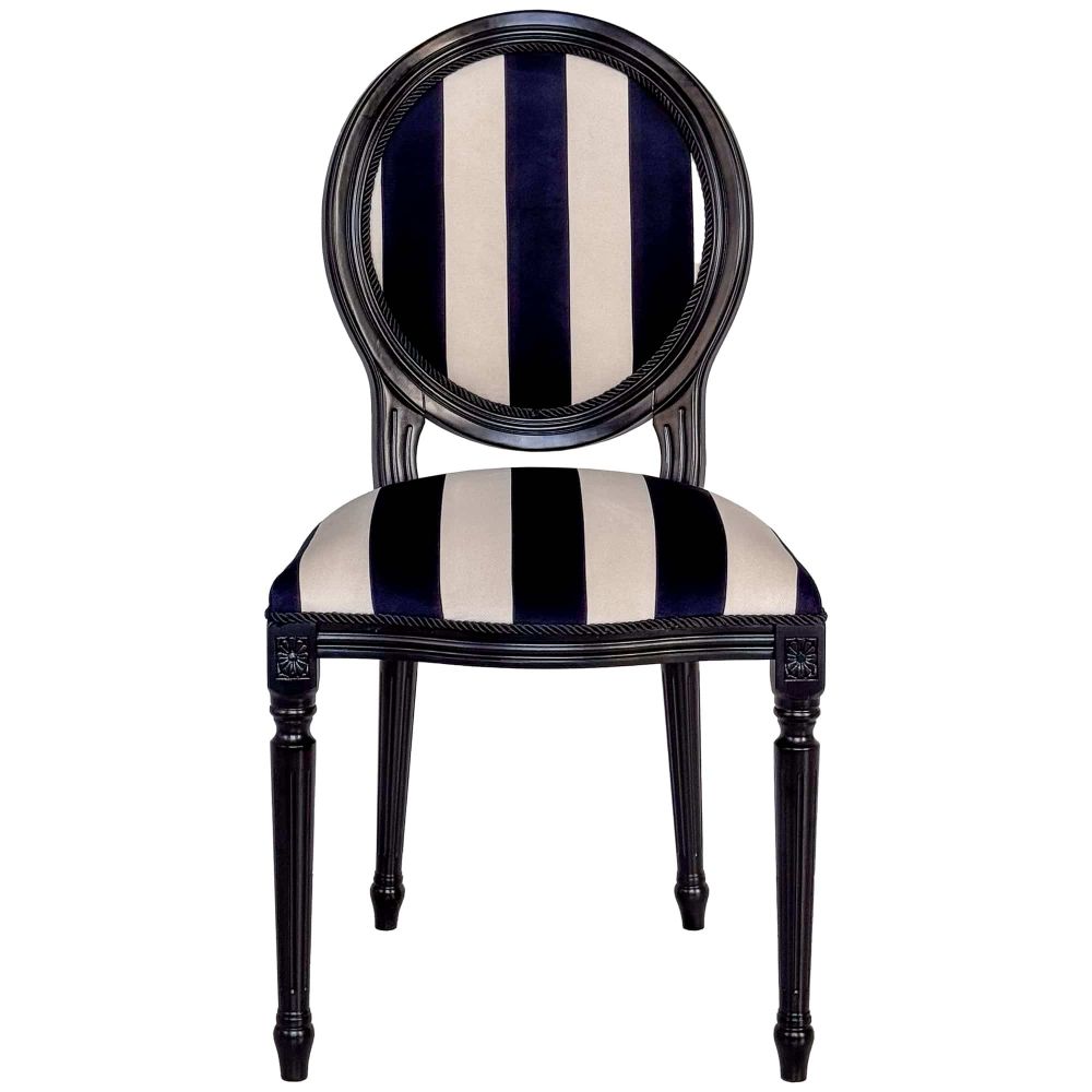 Обивка: Премиальный мебельный микровелюр в контрастную черно-белую полоску. Материал невероятно приятен на ощупь, устойчив к истиранию и прост в уходе. Классический вертикальный узор визуально вытягивает силуэт, добавляя стулу элегантности.