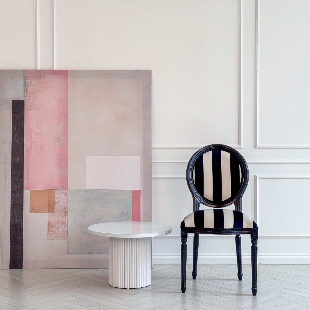 Мы предлагаем не новодел, а настроение. Стул «Голливуд» — это воплощение эстетики «Hollywood Regency»: дерзкое смешение строгой классики и театрального гламура. Черно-белая графика обивки, отсылающая к образам Баухауса, и скульптурный черный каркас создают идеальный визуальный диалог. Это готовое дизайнерское решение, которое не требует декораций.