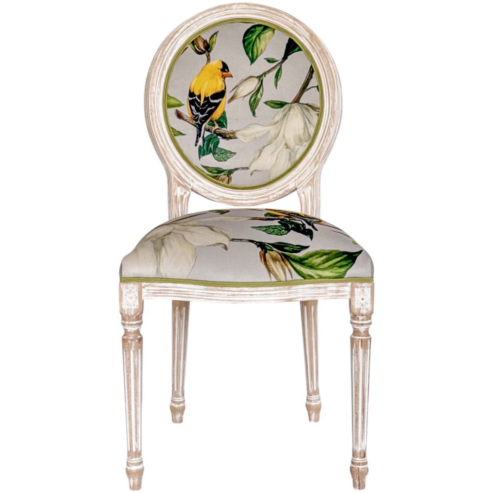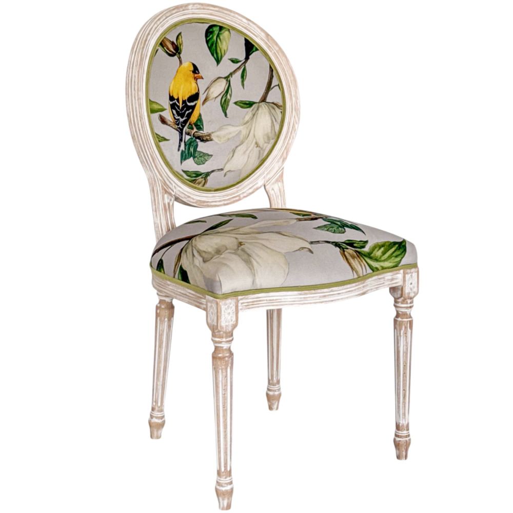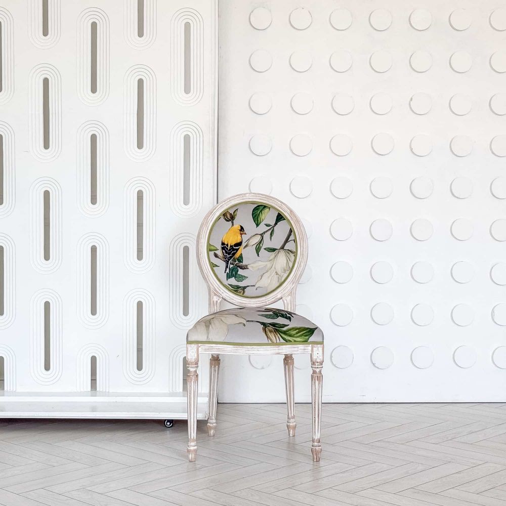 Цвета: светлый с белой патиной (каркас), светло-серый с магнолией и желтой птичкой (обивка)