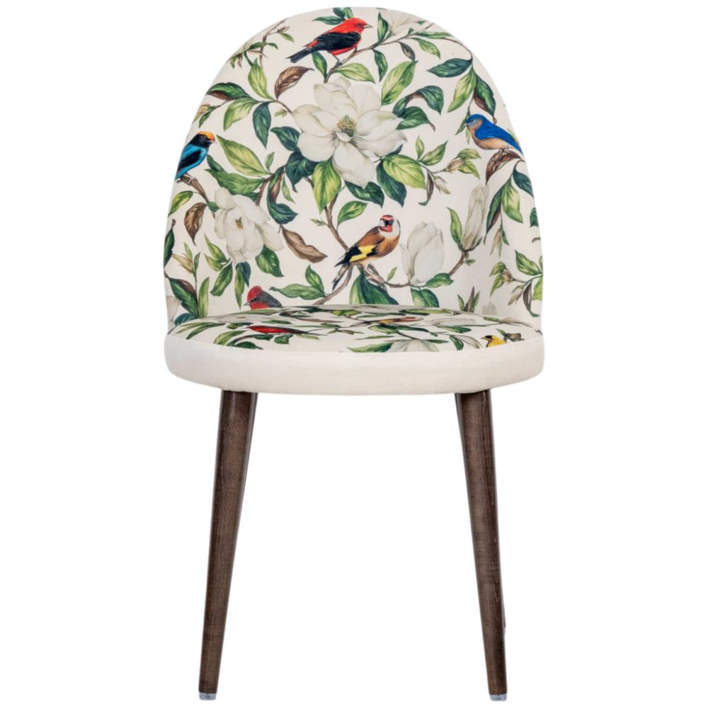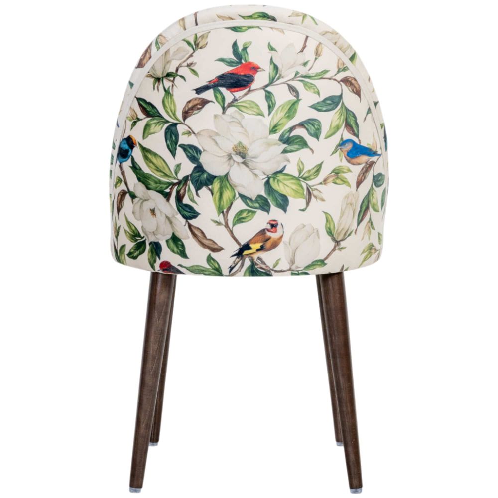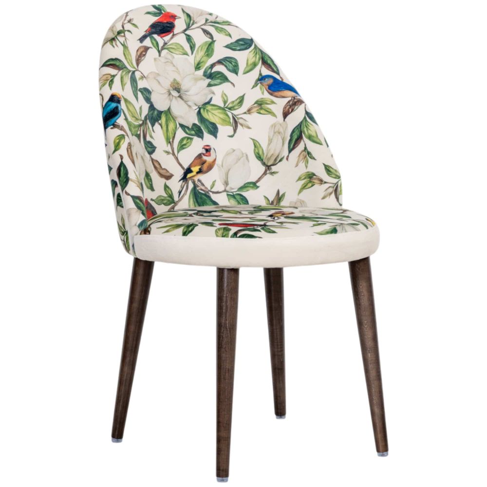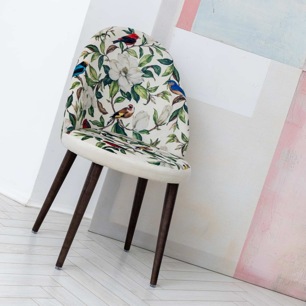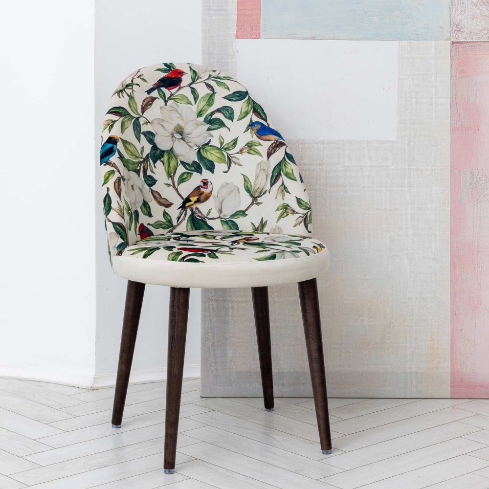 Кресло «Цветущая аристократка» в версии Сити 1 вайт переосмысливает классические мотивы на современный лад. Округлое сиденье и высокая конусообразная спинка с плавными очертаниями придают модели актуальный, скульптурный силуэт. Светлая обивка с белыми магнолиями и яркими птицами напоминает цветущий сад, но выглядит свежо и графично благодаря современным формам.