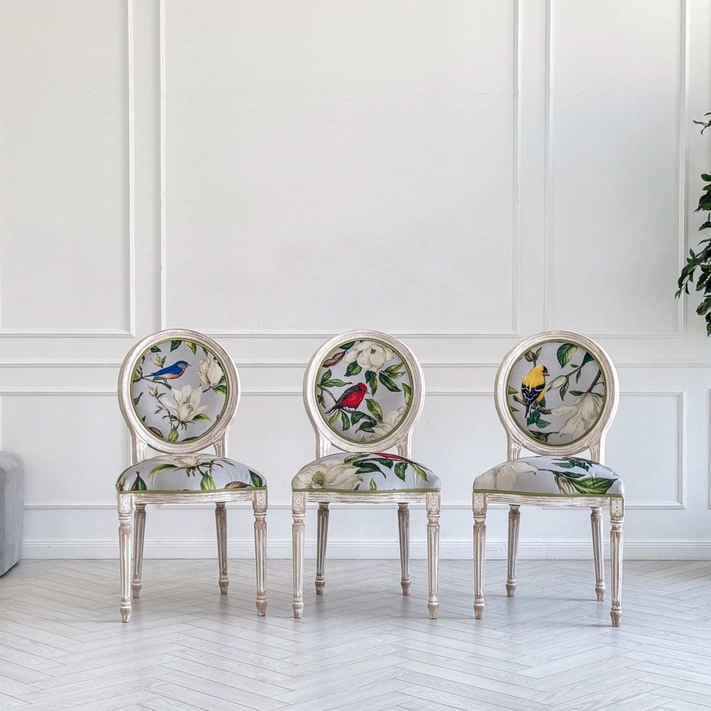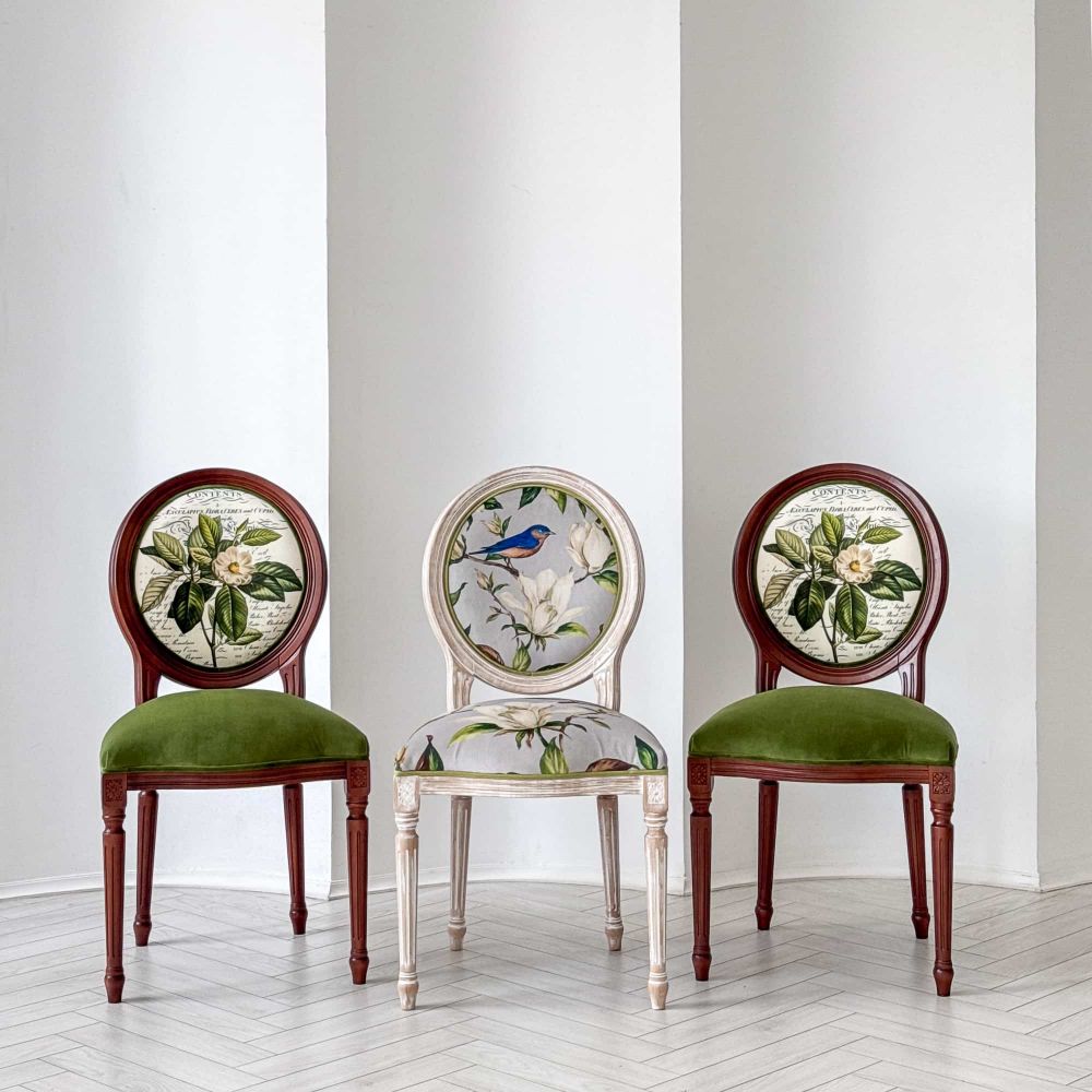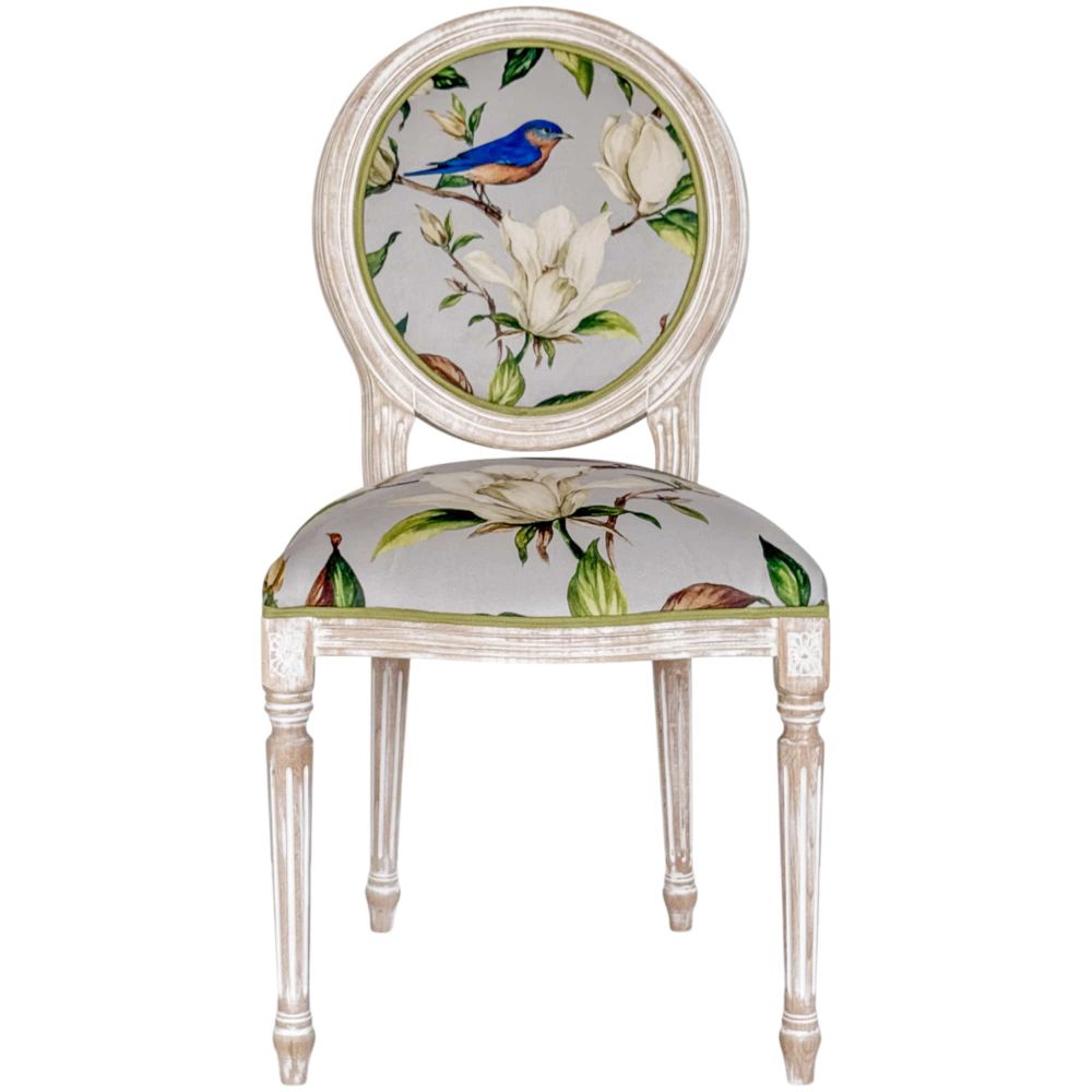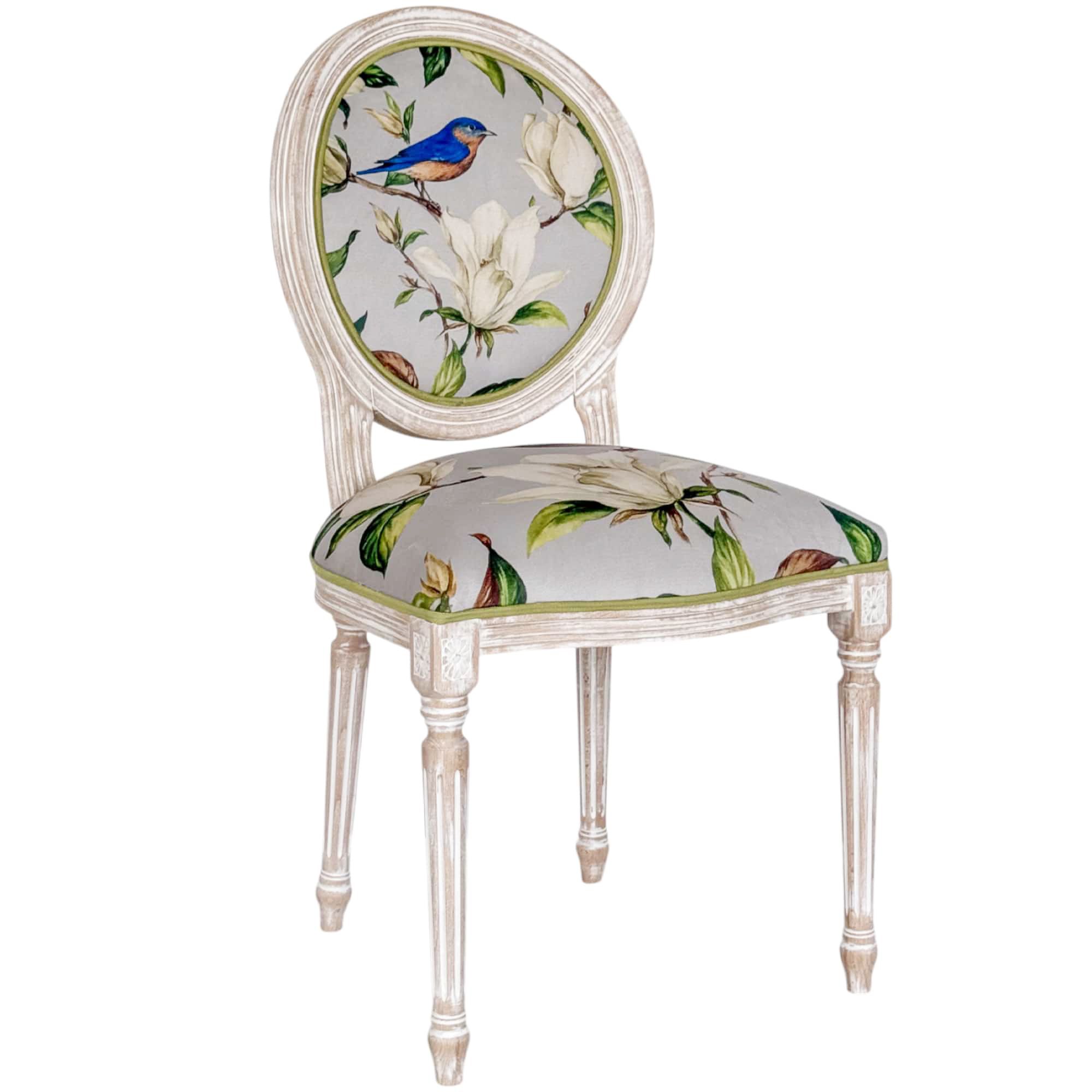 Особого внимания заслуживает обивка. На светло-сером фоне распускается величественная магнолия – ее нежные лепестки словно сотканы из света. Высочайшая детализация цветка создает потрясающий эффект реалистичности и объема. А на элегантной ветке расположилась яркая лазурная птичка, словно готовая взлететь к солнцу. Эта композиция наполняет стул жизнью и становится источником вдохновения.