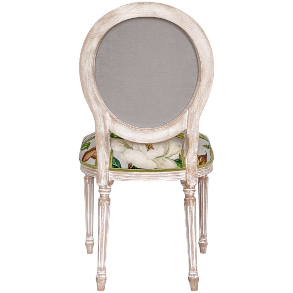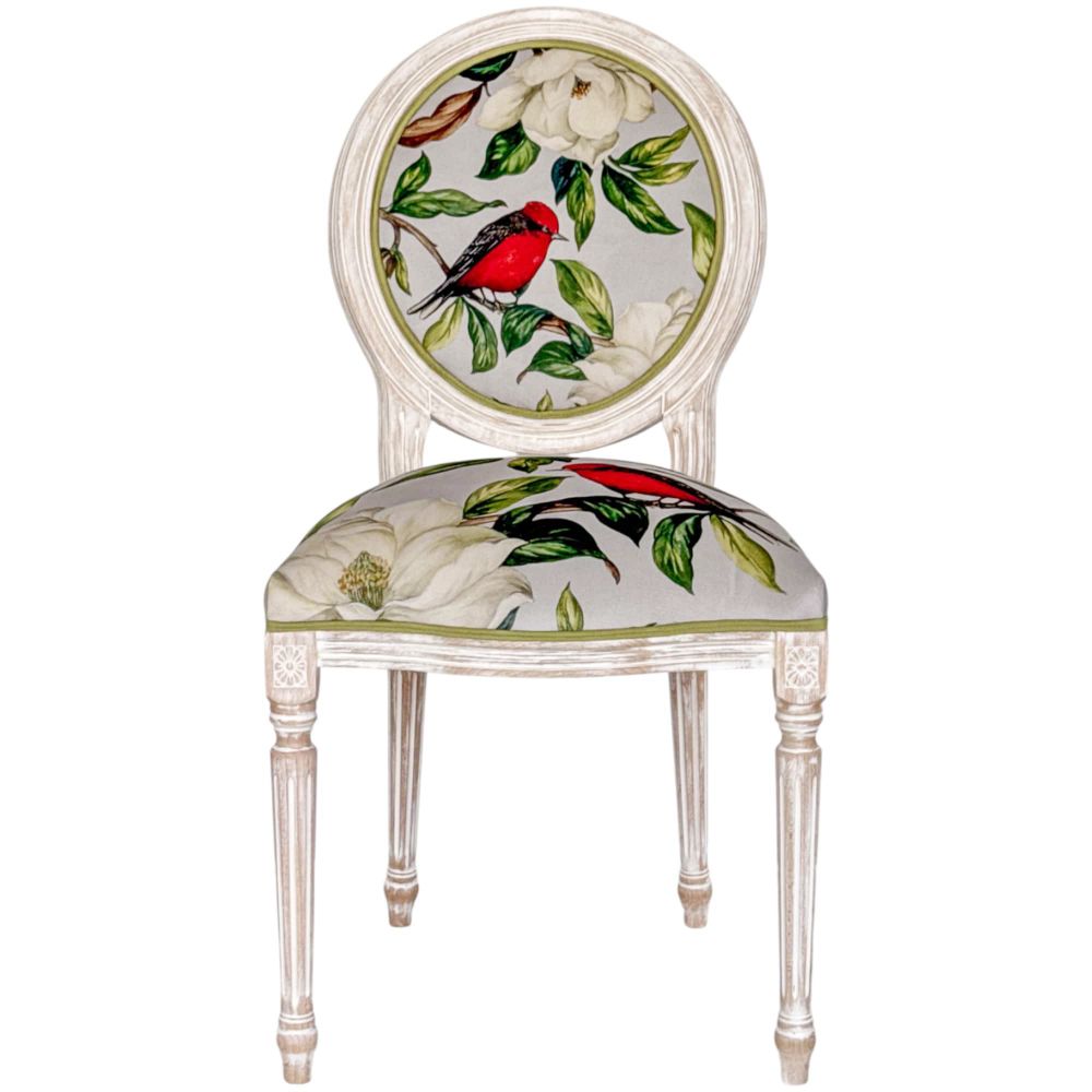 Стул «Цветущая аристократка» версия 9 воплощает эту мечту в реальность. Его каркас из массива бука выполнен в светлом оттенке с добавлением белой патины – благородная отделка, которая подчеркивает текстуру древесины и придает стулу вид изысканного винтажного предмета. Резные ножки с плавными линиями, переходящими в изящный узор с цветком у сиденья, отсылают к роскоши эпохи Луи-Филиппа.