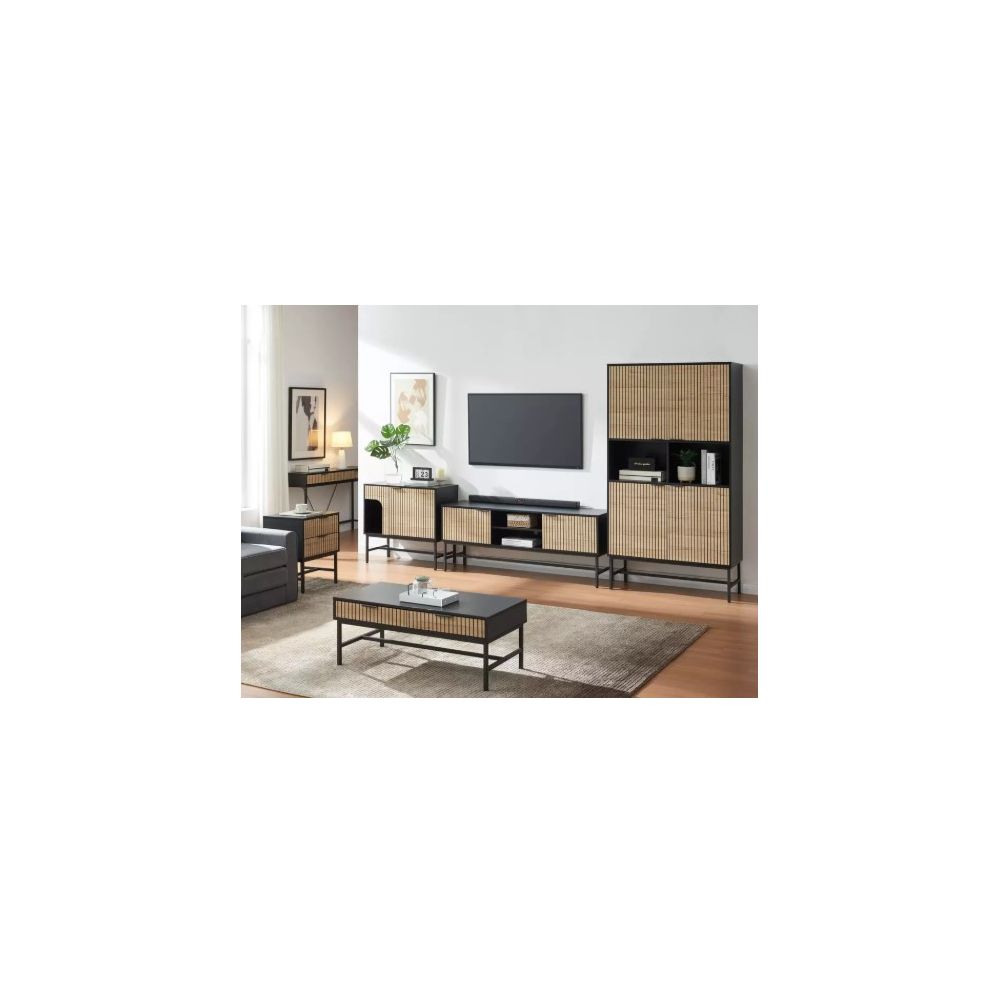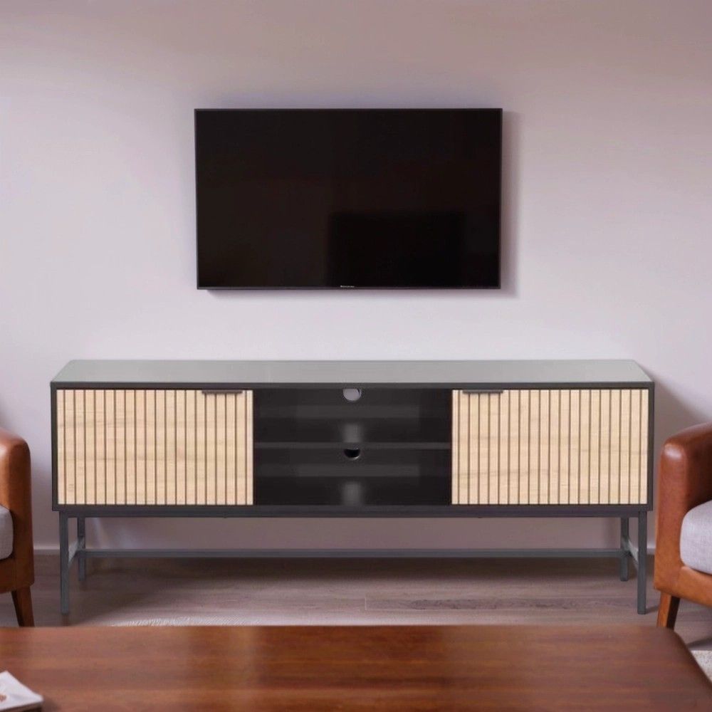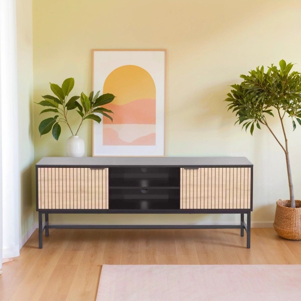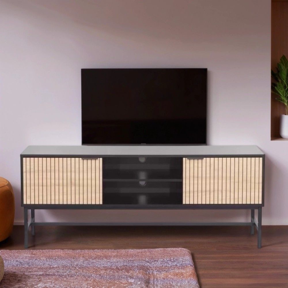 Функциональная тумба под телевизор из коллекции MAGO. Модель сочетает современный дизайн с практичностью. Отделка выполнена в цветовой гамме дуб/черный мат, материалы — ЛДСП и металлический каркас. Гарантия 12 месяцев.